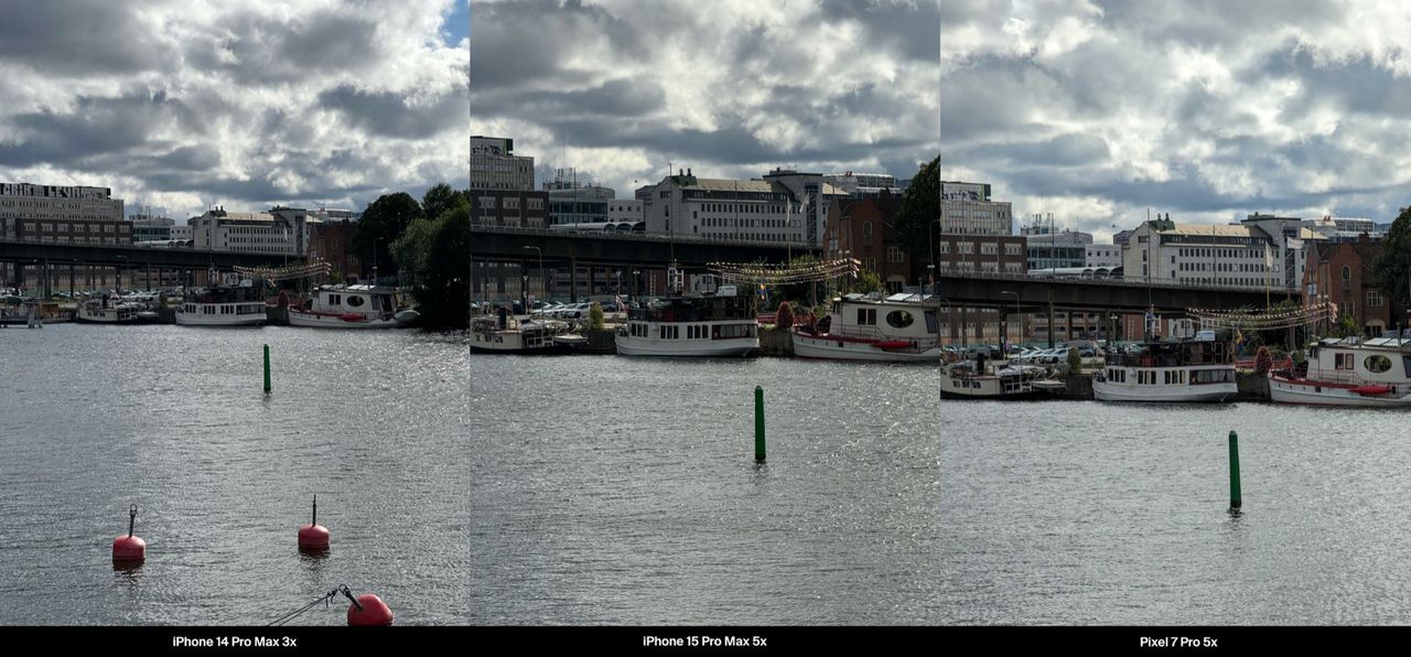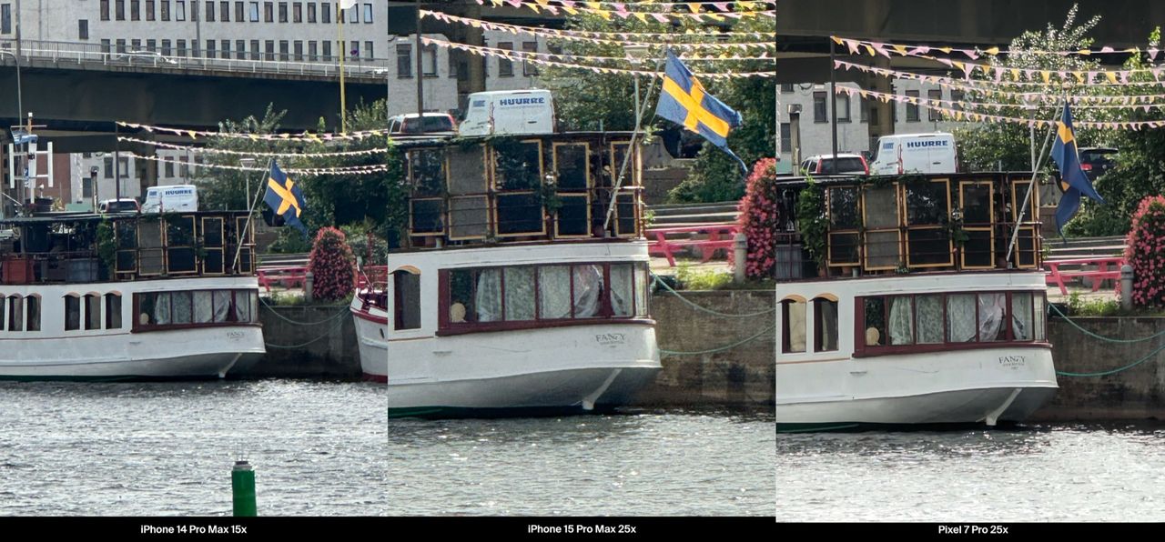 Jag har tyvärr inte haft en Samsung Galaxy 23 Ultra under testet, den luren har ju 10x optisk zoom och hade varit intressant som jämförelse, men har jämfört med en Pixel 7 Pro som har 5x precis som iPhone. Pixel-telefonen är ju ett år gammal och får strax en efterföljare så man kan tycka att Apple borde hunnit ikapp så här ett år senare, men i de testbilder jag har tagit ligger Pixel fortfarande steget före vid full optisk zoom, det vill säga 5x. Apple skryter om att zoom-kameran i iPhone 15 Pro Max har optisk stabilisering i tre ledder men det verkar inte hjälpa speciellt mycket. Går man bortom 5x och lägger till digital zoom så skulle man kunna tro att iPhone är lite på lyset och har smuttat på nubben, för text och linjer känns inte alls ok. Om ni kollar på bilden från iPhone 14 Pro Max, som maximalt går till 15x, så känner ni igen beteendet där. Inte alls ok faktiskt, bilden från Pixel går ju faktiskt att använda medan iPhone-bilden ser ut att komma från en riktigt usel AI-tjänst.