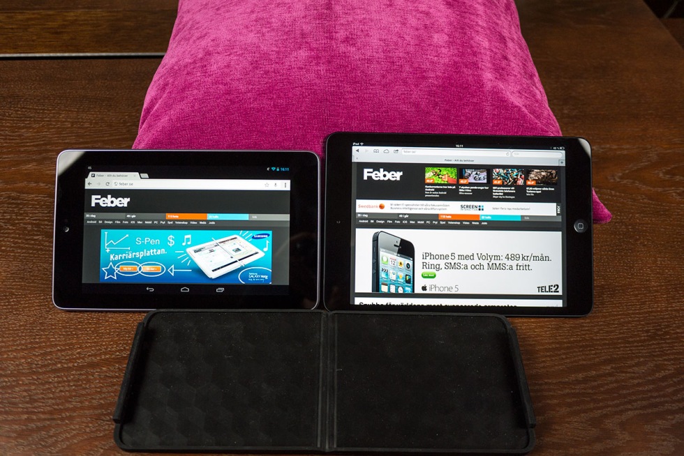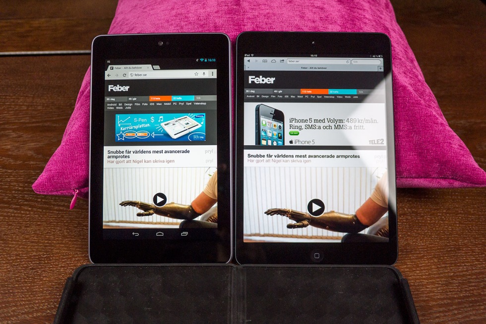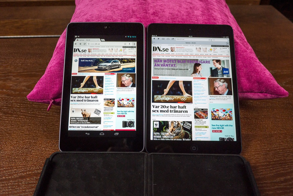 Vi gillar ju både Nexus 7 och iPad mini här på kontoret och har fått en hel del frågor om storleksskillnaden på skärmarna. Nexus 7 vinner ju upplösningskriget och som jag har sagt tidigare så är det riktigt trist att iPad mini-skärmen inte är ett eller två steg skarpare. Men hur mycket webb får man plats med på de olika skärmarna? Apple snackade ju en hel del om detta på presentationen av iPad mini, men snackade de goja?Svaret är att lite olika beroende på om det är responsiva webbplatser eller inte. "Gamla" siter som till exempel dn.se gör större skillnad än modernare siter som tex Feber.se. "Värsta" exemplet ser ni ovan, om man surfar in på DN.se och har de små sötnosarna i liggande läge är skillnaden rätt stor som ni ser i exemplet ovan. Om man istället surfar in på DN.se med dem i stående läge får man plats med lika mycket innehåll på höjden, men innehållet är betydligt smalare på Nexusen. Surfar man istället in på en sida som är responsiv, som Feber.se, blir skillnaden inte alls lika stor. Visst är ytan större på iPad minin men man får inte in mer information. 4:3 är ju ingen höjdare för film men för webb är det rätt trevligt trots allt. Tyvärr gör den sämre upplösningen per tum på iPad minin att det inte är någon höjdare att läsa en artikel på tex dn.se i fullt utzoomat läge - det är nästan krav på att zooma in om man ska läsa om det gäller mer än en ingress. Å andra sidan gäller samma sak för Nexusen, i alla fall i stående läget, eftersom texten blir så liten.I inzoomat läge, eller då webbsiten har vettig fontstorlek från början, vinner ändå Nexusen eftersom den högre upplösningen gör texten skönare att läsa. Man kan tydligen inte få allt här i världen.