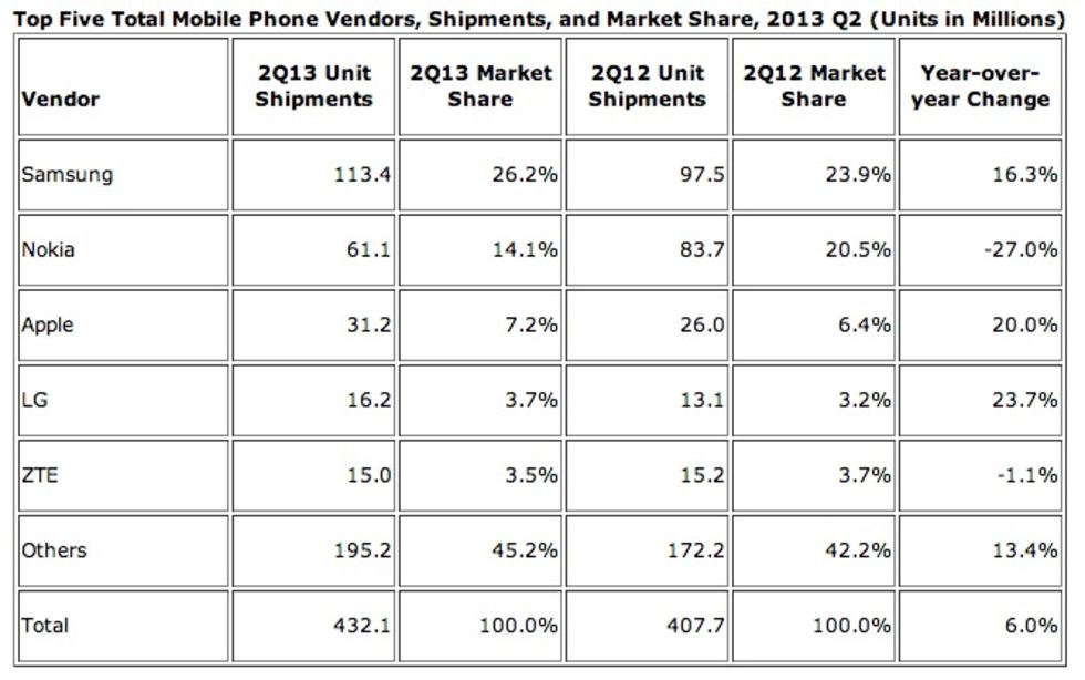 Research-företaget IDC har släppt ny statistik för antalet sålda smartphones under årets andra kvartal och Samsung ligger fortfarande i topp med 72.4 miljoner enheter sålda vilket motsvarar lite mer än 30% av alla smartphones som såldes under perioden.Efter Samsung följer Apple med 31,2 miljoner sålda enheter, LG (12,1 miljoner), Lenovo (11,3 miljoner) samt ZTE (10,1 miljoner). Dessa fem tillverkare står för sammanlagt nästan 60% av de smartphones som såldes under kvartal två 2013 medan resten av tillverkarna som till exempel Sony, HTC, BlackBerry, Nokia med flera delar på de återstående 40%.Ser man till de fem främsta tillverkarnas siffror för kvartal två 2012 så kan man se att både ettan och tvåna, Samsung och Apple, tappar marknadsandelar medan LG, Lenovo samt ZTE ökar, om än blygsamt, sina marknadsandelar.Totalt såldes det 432,1 miljoner mobiltelefoner under kvartal två 2013 (se bild ovan) och utav dessa klassades 237,9 miljoner som smartphones. Intressantast här är väl att Nokia fortfarande är världens näst största mobiltillverkare och sålde dubbelt så många mobiltelefoner som Apple under Q2 2013. Dock sannolikt med mycket lägre vinstmarginal än Apple.