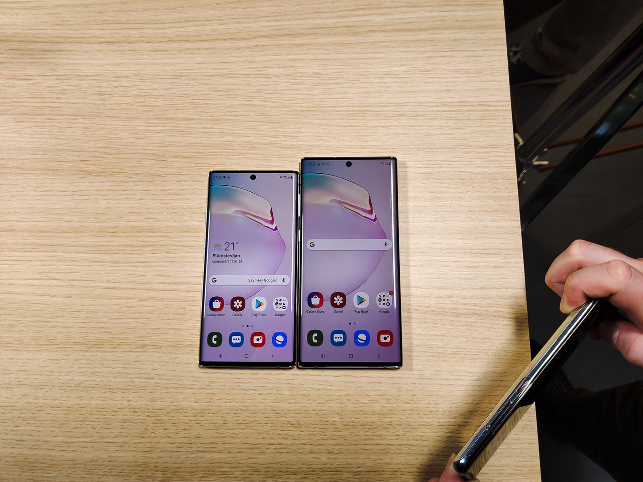 På designfronten följer Note 10-enheterna samma linje som S10. Det handlar om tunna och lätta enheter med skärm som täcker större delen på framsidan. Det som skiljer Note 10 med S10 är en mer rektangulär design samt att skärmen har Infinity O-design med ett centrerat kamerahål i toppen av telefonen. Jag har alltid tyckt att den kantiga designen gör Note-telefonerna lite klumpiga, speciellt när skärmstorleken ständigt blir större. Och värre blir det alltid när skal appliceras. Därför uppskattar jag verkligen valet att leverera en mindre version av Note 10 på ”endast” 6,3 tum. Det gör att telefonen får ungefär lika stort fotavtryck som S10+ men levererar samma användningsupplevelse som storasyskonet. Det tackar både mina händer och fickor för. Utöver det känns telefonerna som Samsungs tidigare flaggskepp. Rundat glas både fram och bak gör att telefonen ligger bra i handen, vilket gäller både Note 10 och Note 10+. Något som är riktigt trevligt är att enheten endast har powerknapp och volymrocker på vänstra sidan, medan den högra sidan saknar knappar helt. Ni som kört Samsungtelefoner de senaste åren reagerar kanske på att jag inte nämner Bixby-knapp och det beror på att en sådan knapp inte finns. Detta är kalasbra då knappen varit ett hatobjekt sedan för första gången applicerades på en Galaxy-lur och det är trevligt att Samsung faktiskt lyssnar på kritik. Även om det har tagit ett par år. På ovansidan av telefonen sitter det lite mikrofoner samt simkortstjofräs och denna skiljer sig en aning beroende på om du vill ha Note 10 eller Note 10+. I den stora versionen kan du peta in två nano-sim-kort eller ett simkort och ett minneskort medan i den lilla varianten kan du endast köra dubbla sim-kort. Detta är lite tråkigt för minneskortanvändare, men då båda enheterna skeppas med minst 256GB lagring så känns detta ändå okej. Och om man verkligen vill ha mer lagring så är det bara att köra på Note 10+. Undersidan kommer med en tråkig överraskning. Samsung har rättat sig i ledet med resten av mobilbranschen och plockat bort hörlursuttaget. Det följer givetvis med en dongle och ett par USB-C-lurar i lådan, men att kunna ladda luren och lyssna på musik trådat kommer inte vara en möjlighet. Lite trist, men då jag inte riktigt kan minnas när jag senast använde ett par trådade hörlurar för att lyssna på musik på telefonen så är det fine. Helt fine.