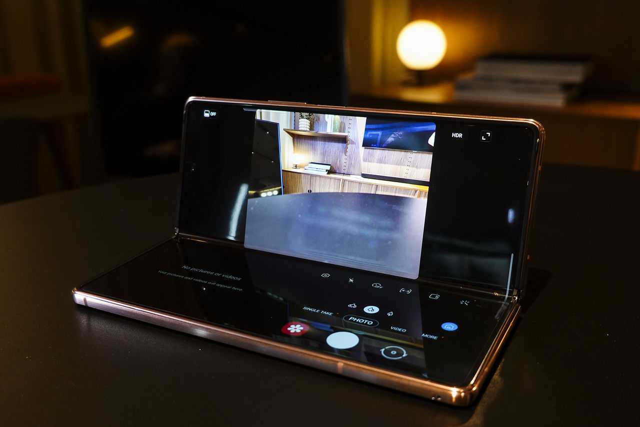 Den nya skärmen måttar in på 6,2 tum och har avlångt bildförhållande. Med första Fold kändes frontskärmen som en glorifierad aviseringsskärm, men den nya större panelen är det möjligt att göra mycket mer. Det är inte längre irriterande att navigera och pilla med appar då det känns mer som en avlång telefon än en miniskärm. Som det ska vara, helt enkelt.Viker man upp telefonen så är det första man slås av att gångjärnet känns riktigt bra. Det är verkligen inte så slappt som i föregångaren och det känns gediget. Hur gediget gångjärnet kommer vara efter något års användning är oklart, men förhoppningsvis kommer det vara stabilt länge. Den nya stabiliteten gör inte bara att telefonen känns mer rejäl, utan den kommer även till nytta. Vid plåtning kan man vika telefonen 90 grader och använda den som en tripod för stabilare resultat eller så kan man vinkla skärmen när man ser på film. Videon, eller kamerabilden, hoppar då upp till skärmens övre hälft och lämnar den nedre delen för diverse användbara knappar och reglage.