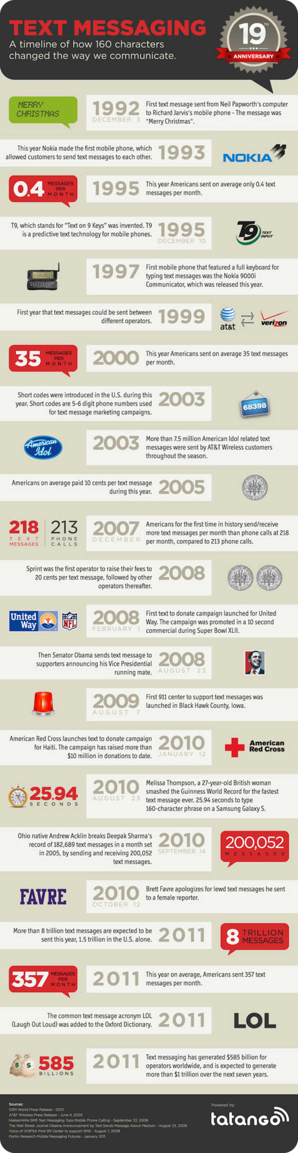 Idag är det exakt 20 år sedan det första SMS:et togs emot av en mobiltelefon. Det var Neil Papworth som skickade detta från sin dator till Richard Jarvis på Vodafone som tog emot detta historiska SMS med telefonen Orbitel 901 som ni kan kolla in på bilden. Meddelandet som skickades löd "MERRY CHRISTMAS" vilket jag antar passade bra då julen stod inför dörren.1993 kom de första kommersiella SMS-tjänsterna igång men till en början var intresset förhållandevist lågt och 1995 skickade det endast i genomsnitt 0,4 SMS per månad och användare. År 2000 hade dock denna siffra höjts till 35 SMS per månad och användare. Förra året skickades det totalt 10 biljoner SMS i världen.Under "Läs mer" hittar ni en infografik med utvalda delar av SMS:ets historia.