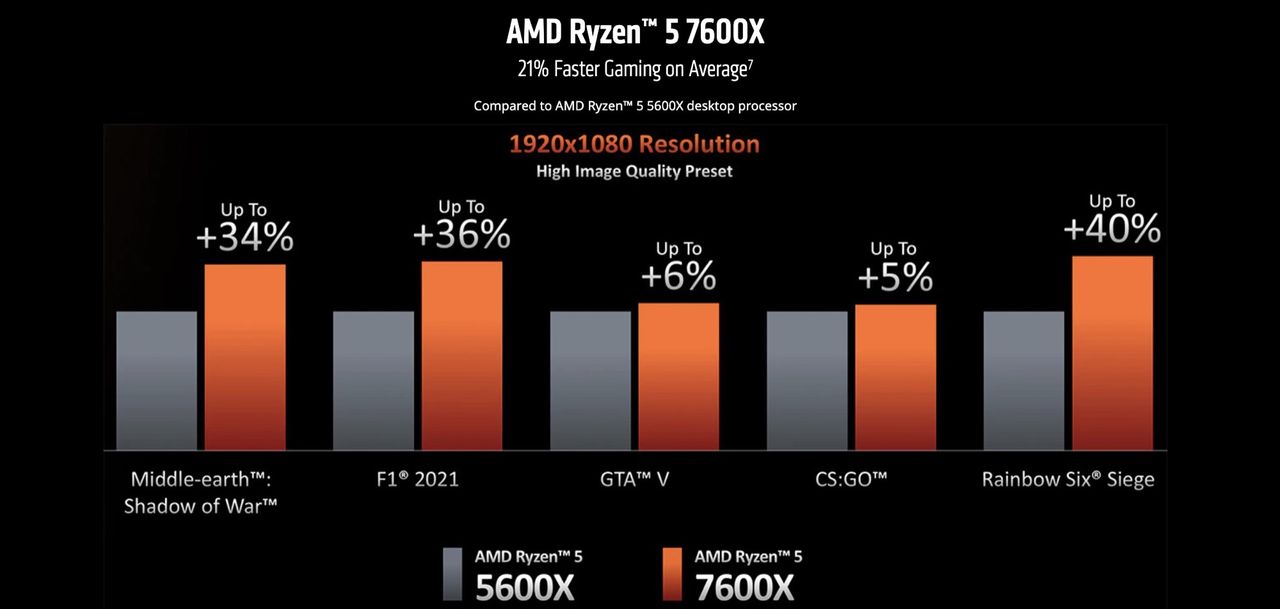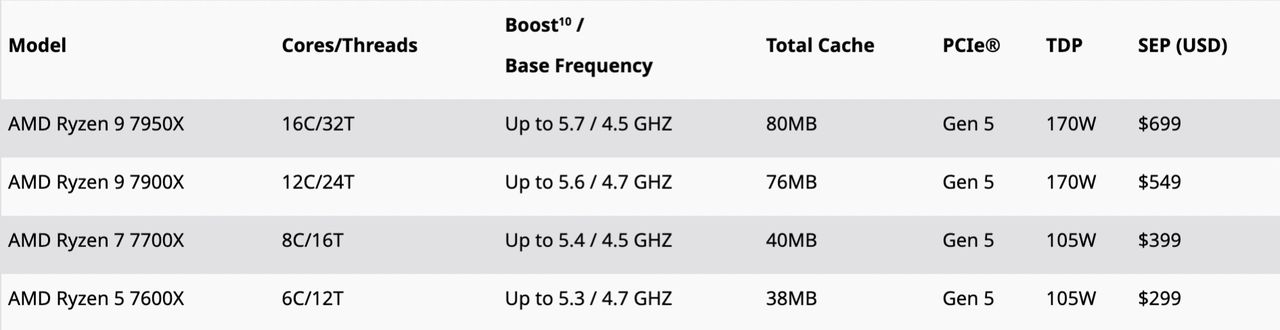 Igår presenterade AMD sin nästa generations processorer Ryzen 7000 officiellt under en tillställning som leddes av företagets vd Lisa Su. De fyra CPU:erna i Ryzen 7000-serien som man nu presenterat är byggda på AMD:s Zen 4-arktitektur och har 6 till 16 kärnor. Det är AMD:s första desktop-processorer som är byggda med 5nm-teknik. AMD utlovar ordentliga hastighetsförbättringar för processorna i Ryzen 7000-serien jämfört med dem man släppt i Ryzen 5000-serien. Exakt hur mycket snabbare de är beror givetvis på vilken uppgift som utförs med datorn och vilken av de nya processorerna som används. AMD skriver dock att spel i genomsnitt kan bli upp till 21 procent snabbare om man kör Ryzen 5 7600X jämfört med föregångaren Ryzen 5 5600X. Ni kan se några exempel som AMD tagit fram själva nedan. Foto: AMDDe fyra processorerna i Ryzen 7000-serien som AMD presenterade igår kommer att släppas 27 september. Priserna kommer att ligga på cirka 300 dollar för den 6-kärniga Ryzen 5 7600X medan den dyraste, den 16-kärniga Ryzen 9 7950X, kommer att kosta cirka 700 dollar. Ni hittar priser och lite mer specifikationer i tabellen nedan. Foto: AMDHär nedanför kan ni kolla in ett sammandrag från när AMD presenterade Ryzen 7000-processorerna.