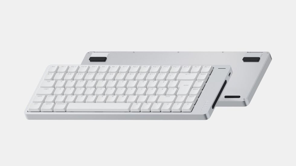 Anslut det på tre sätt: 2,4 GHz, Bluetooth eller kabelanslutning via USB-C. På tangentbordet sitter även ett touchkänsligt fält för volym och skärmljusstyrka, plus utfällbara fötter.