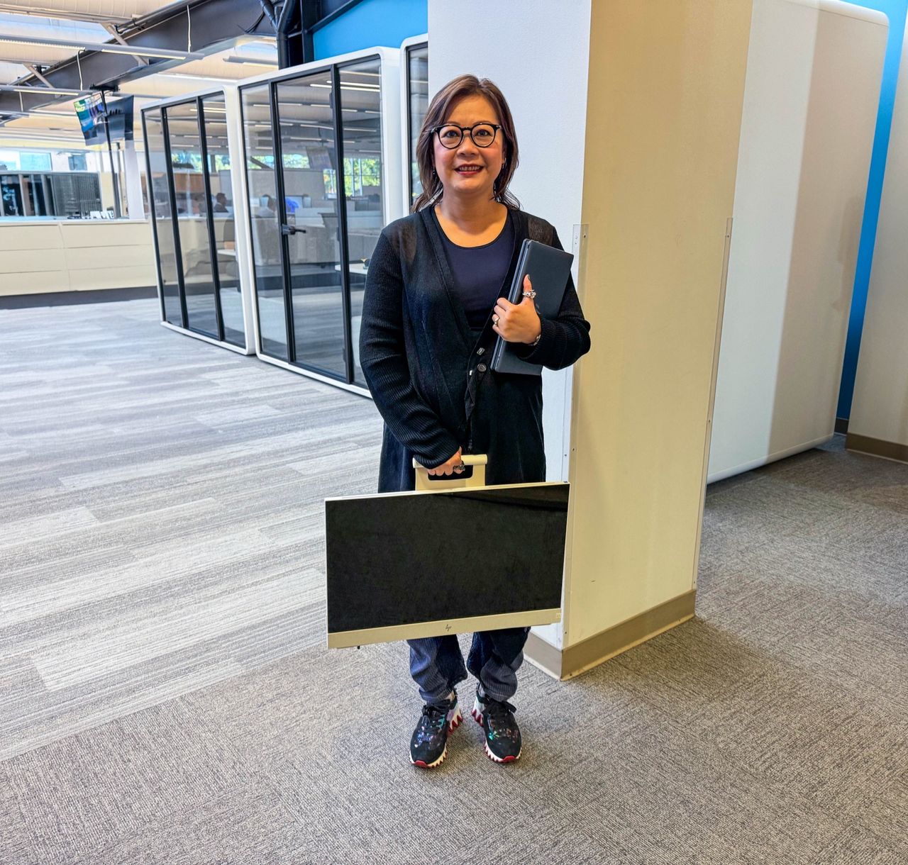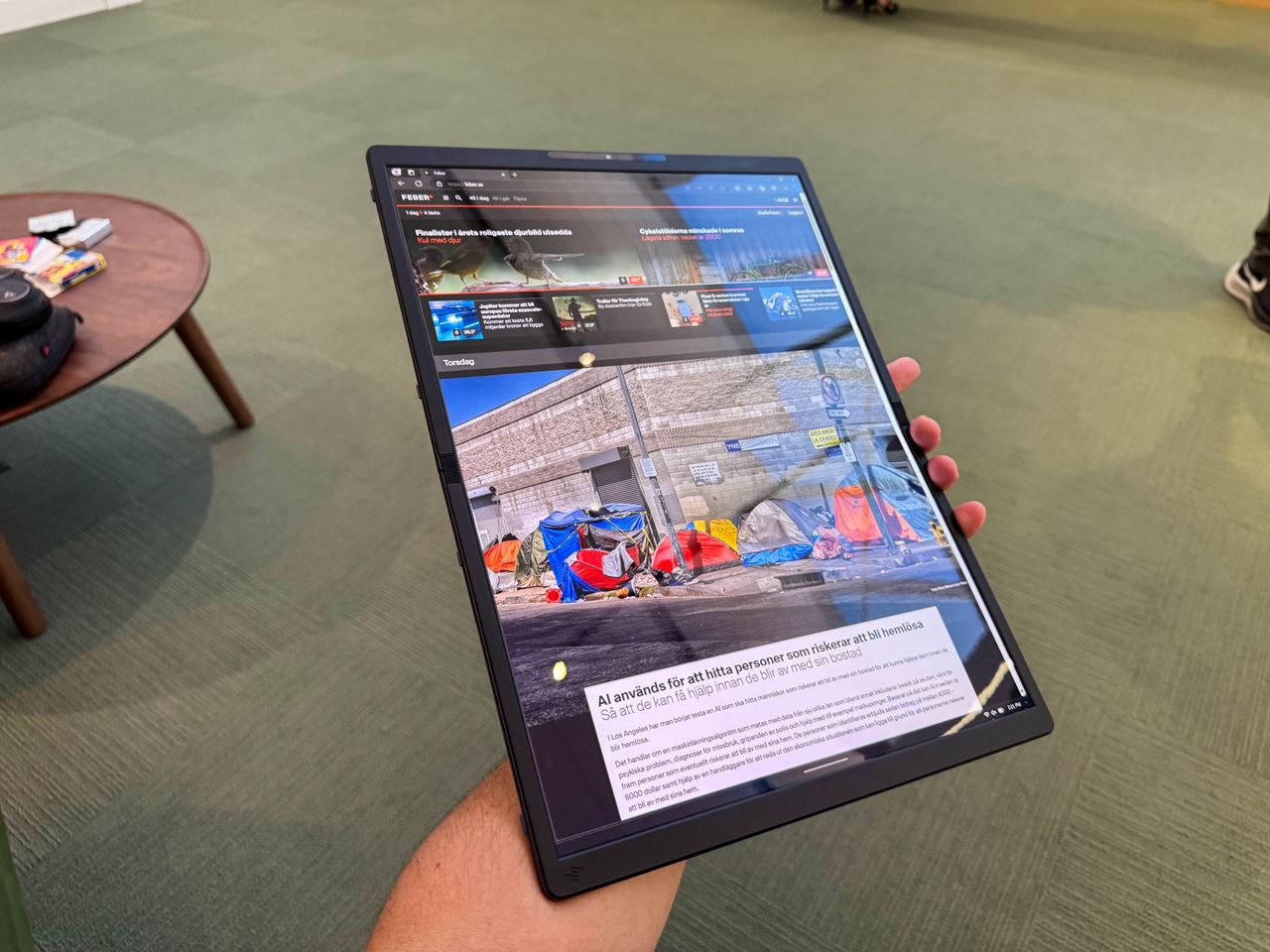Vi pratade med Josephine Tan som har basat över utvecklingen av denna och när hon berättar om konstruktionen så säger hon att denna har varit på gång under en längre tid och att de har haft färdiga prototyper länge, men de var aldrig riktigt så nöjda att de ville släppa den. Men nu är de där de tycker att en första version kan få se dagens ljus. Hon säger också att ju fler vikbara telefoner som Google, Samsung och de andra säljer, ju närmare kommer vi en vikbar dator med rimligt pris. För den här kostar 5000 dollar och om den är värd det får man såklart bestämma själv. Klart är att bygget är väldigt snyggt. Visst är den lite tung men vikten i maskinen är jämnt och den känns användbar i den meningen att den inte känns som att den ska gå sönder när som helst. Josephine TanDetta trots att ramen runt skärmen, som har upplösningen 2560x1920 pixlar, är väldigt tunn. Det har man bland annat lyckats med genom att sätta skärmens kontakter till resten av datorn på kortsidan istället för på långsidan. Josephine är, med rätta, väldigt stolt över sitt bygge. Att enheten är vikbar gör att den inte bara kan vara en laptop på 12,3 tum utan även en tablet eller en "desktop" på 17 tum. Den har nämligen ett kickstand på baksidan av enheten så att man kan ställa upp den på bordet och använda den som en skärm, men det avtagbara tangentbordet som tangentbord. Ytterligare en smart grej finns och det är att man kan dra ner tangentbordet lite grann och då kan man använda mer av skärmen i laptop-läge, tex ha ett chattfönster eller något annat trevligt där nere. Det fina är att tangentbordet är lite vikbart så att det blir som ett handlovsstöd när man har enheten på bordet. Detta läge fungerar faktiskt ok även i knät. Det finns två batterier i enheten så att den ska få en skön jämnvikt mellan de två delarna. Och den känns verkligen balanserad, om än tung. Priset är såklart en dealbreaker på den här, den är alldeles för dyr för att vara något för alla, men kategorin börjar se lovande. Det här formatet med en Snapdragon X hade varit riktigt trevlig, då hade man möjligen kunnat få ner behovet av batterier en smula och fått den lite lättare. Men det är lovande inför framtiden!