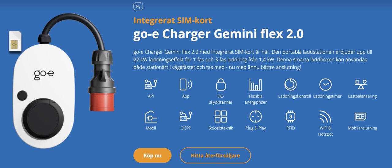 Nu är den här, go-e Charger Gemini flex 2.0 med integrerat SIM-kort. Den portabla laddstationen har upp till 22 kW laddningseffekt för 1-fas och 3-fas laddning från 1,4 kW. Som namnet avslöjar fungerar Gemini flex 2.0 lika bra hemma på väggen som när du ska iväg på äventyr.
