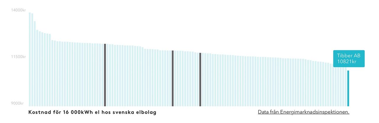 Med fler smarta saker i hemmet är det hög tid att få koll på förbrukningen - i realtid. Med Tibber får du inte bara koll på ett smart och enkelt sätt, du köper även grön el till bästa pris. Här nedanför kan du se en jämförelse för kostnaden hos svenska elbolag (läs mer om prisjämförelsen här). Byt elbolag till Tibber direkt! Klicka här för att börja! Tibber är en app för iOS och Android som ersätter ditt nuvarande elbolag. Du köper grön el till bästa pris och ser direkt i appen både vad elen kostar just nu och från vilken producent du köper den. Du behöver inte göra någonting utom att se elräkningen bli mindre, bytet av elbolag sköter Tibber helt och hållet.
