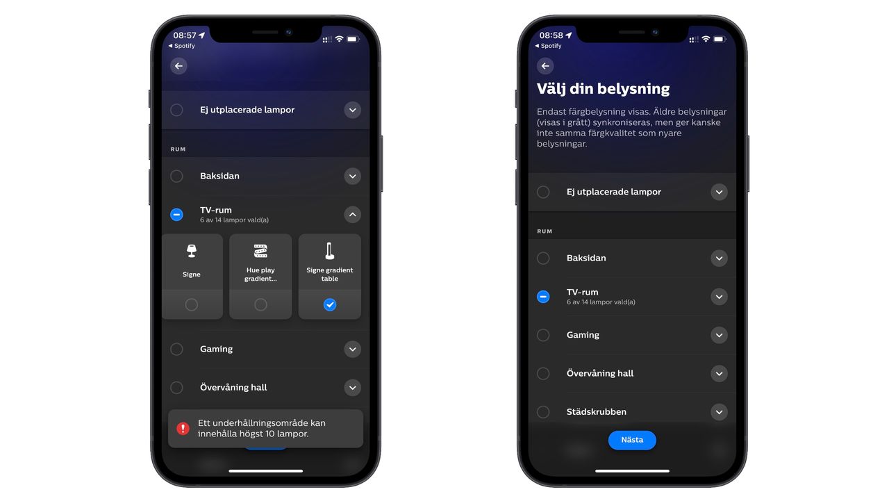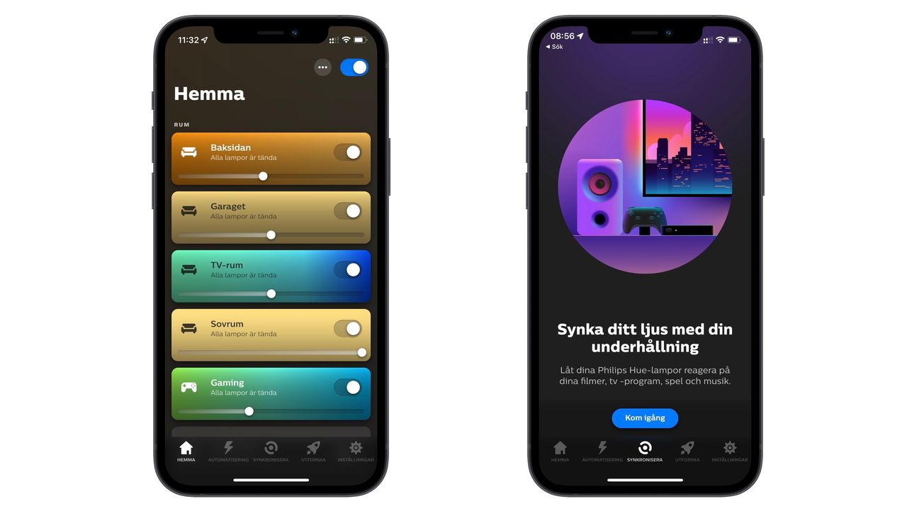 1. Börja med att starta Hue-appen på din telefon och välj Synkronisera och sedan Kom igång. 2. Välj Spotify-konto. Du blir uppmanad att logga in med ditt Hue-konto. 3. Därefter med ditt Spotify-konto och slutligen måste du godkänna att Spotify och Hue får dela information med varandra. 4. Nu får du frågan om du vill använda ett existerande underhållningsområde eller skapa nytt. Vi skapar ett nytt och döper det till något passande. 5. Välj vilket eller vilka rum som dina lampor befinner sig i. Du kan välja upp till 10 lampor för varje underhållningssområde. 6. Tryck nästa och avsluta med att berätta om var dina lampor befinner sig i rummet samt vilken höjd – lamporna blinkar till när du markerar dem så du vet vilken som är vad. När allt är på plats trycker du klar och sedan kan du påbörja synkroniseringen via knappen med en blå cirkel. 7. Utöver att du märker att lamporna reagerar på musiken så ändras nu den blåa cirkeln till att visa fler färger. Här kan du sedan välja stil, styrka, ljusstyrka och färger. Philips Hue har en rad lampor, armaturer och LED-strips. Tänk dock på att du måste välja varianter med RGB-stöd (White and color ambiance) för att synkronisera musiken. På Philips Hues hemsida går det att välja att endast visa lampor som stöder RGB genom att klicka i “Färgat ljus” i filtret, eller så använder denna direktlänk.