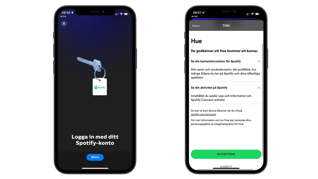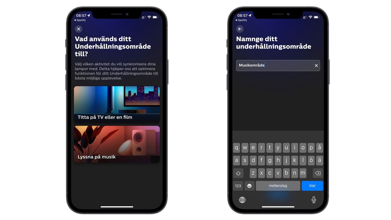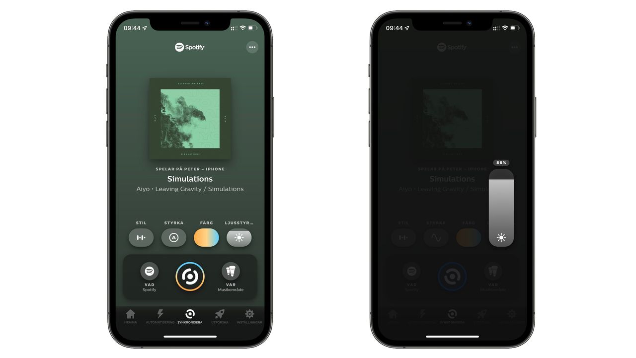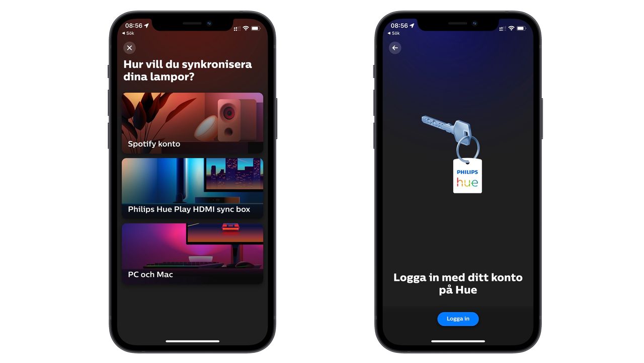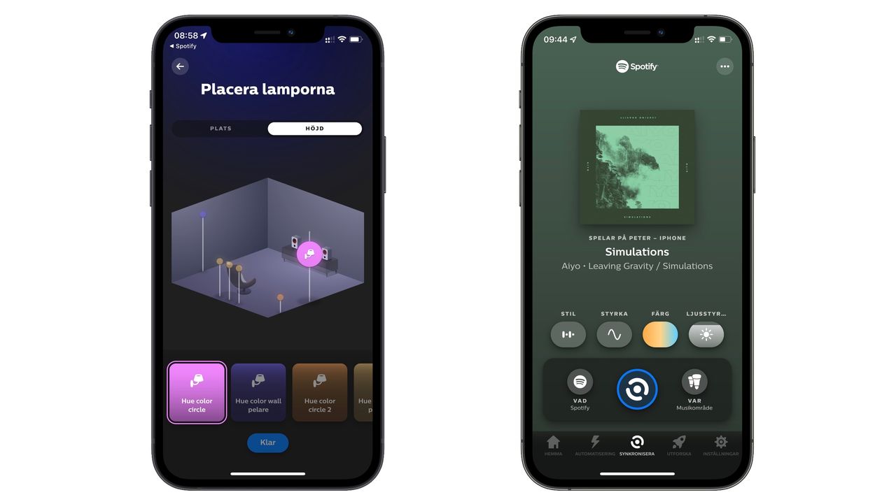 Om du tidigare använt Hue Play HDMI Sync Box eller mjukvaran Hue Sync till din dator så känner du till appen Hue Sync. Det är den som får synkroniseringen att fungera och fram tills nyligen behövdes också den för att definiera underhållningsområden. Det vill säga vilka av våra lampor som skall synkronisera med vad. Men med Spotify-synkronisering hanteras det i din vanliga Hue-app inklusive skapandes av underhållningsområden.Du kan sömlöst växla mellan olika typer av synkronisera direkt från Hue-appen och väljer du till exempel Hue Play HDMI Sync box byter din telefon till Hue Sync-appen automatiskt, eller hänvisar dig att ladda hem den om du inte redan har den installerad.Så kommunicerar Spotify med Hue Sync Istället för att använda telefonens mikrofon är Hue ihopkopplat med Spotify på metadatanivå och skapar ett anpassat ljusskript som – kombinerat med dina egna inställningar – skapar en ljusupplevelse baserat på tempo, humör och naturligtvis vilken typ av låt. Detta utan att någon extra hård- eller mjukvara behövs.