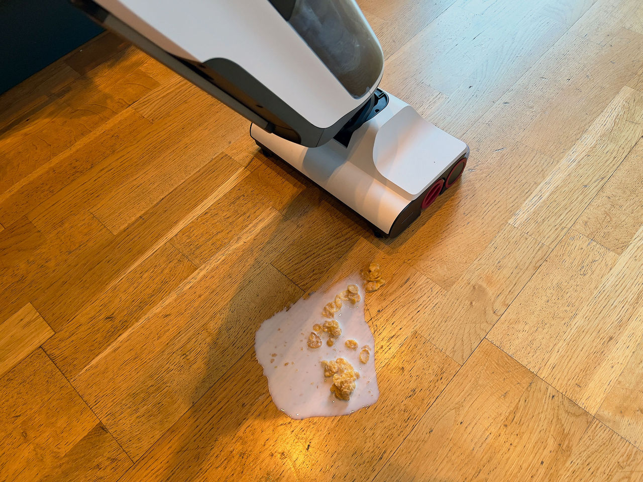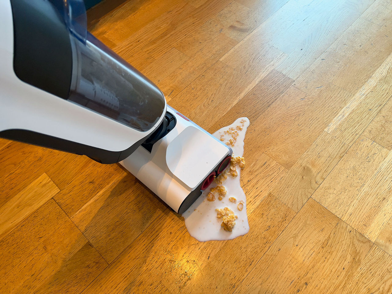 Roborock Dyad är en torr- och våtdammsugare vilket betyder att den dammsuger och moppar på en och samma gång. Otroligt smidigt att kunna göra allt med en maskin. Men det betyder också att den kan ta hand om saker som du tidigare bara har drömt om att kunna ta hand om med en maskin, till exempel en tallrik med mjölk och flingor.