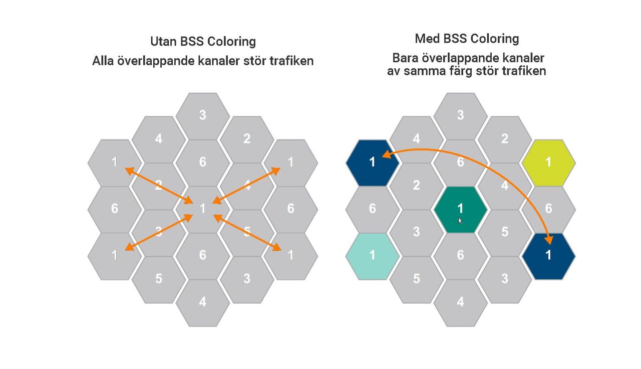 I andra vågen av Wi-Fi 6 så är lösningen på problemet färg med en funktion som kallas BSS Coloring. För att bekämpa problemet med att andra nätverk stör din accesspunkt så ger BSS Coloring ditt nätverk en färg. Din accesspunkt och enheter kommer endast lyssna och prata med enheter som har den bestämda färgen. Det innebär att du kan använda närliggande Wi-Fi-kanaler utan att det stör din trafik. Vilket minskar risken för lagg så länge du och din granne inte använder samma färg på nätverket.Använd mesh för ännu bättre räckvidd