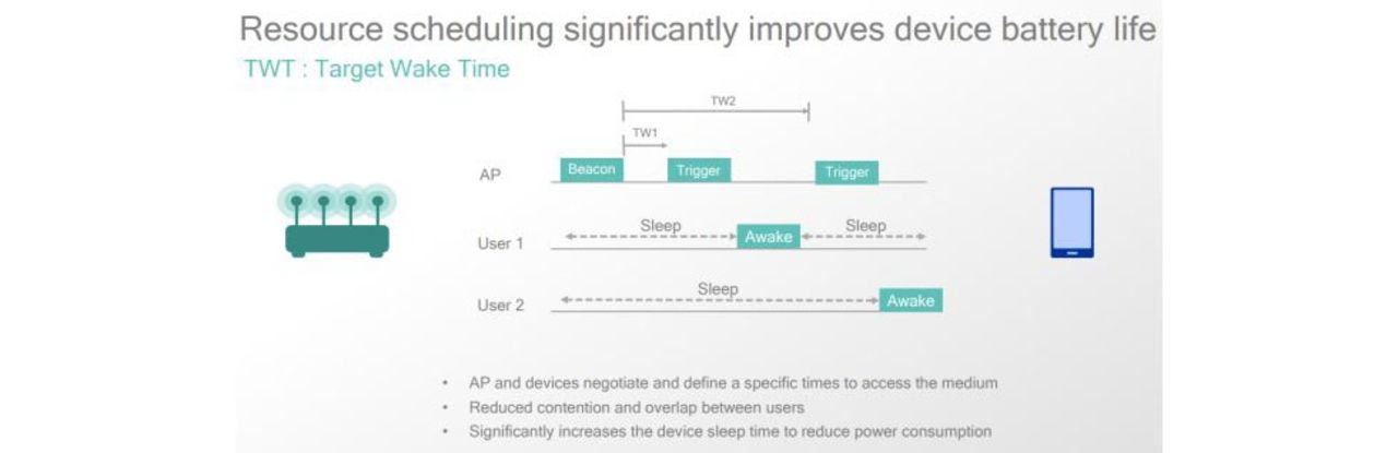Har enheterna inget att säga kan de lika gärna vila. Det är filosofin i ytterligare en av de nya funktionerna med Wi-Fi 6, nämligen Target Wake Time (TWT).TWT gör det möjligt för accesspunkten och den anslutna enheten att samarbeta om när enheten kan skicka sin data till accesspunkten och när den kan vila. Ta till exempel en smarta hemmet sensor som kanske endast behöver uppdatera nätverket om sin status en gång om dagen.