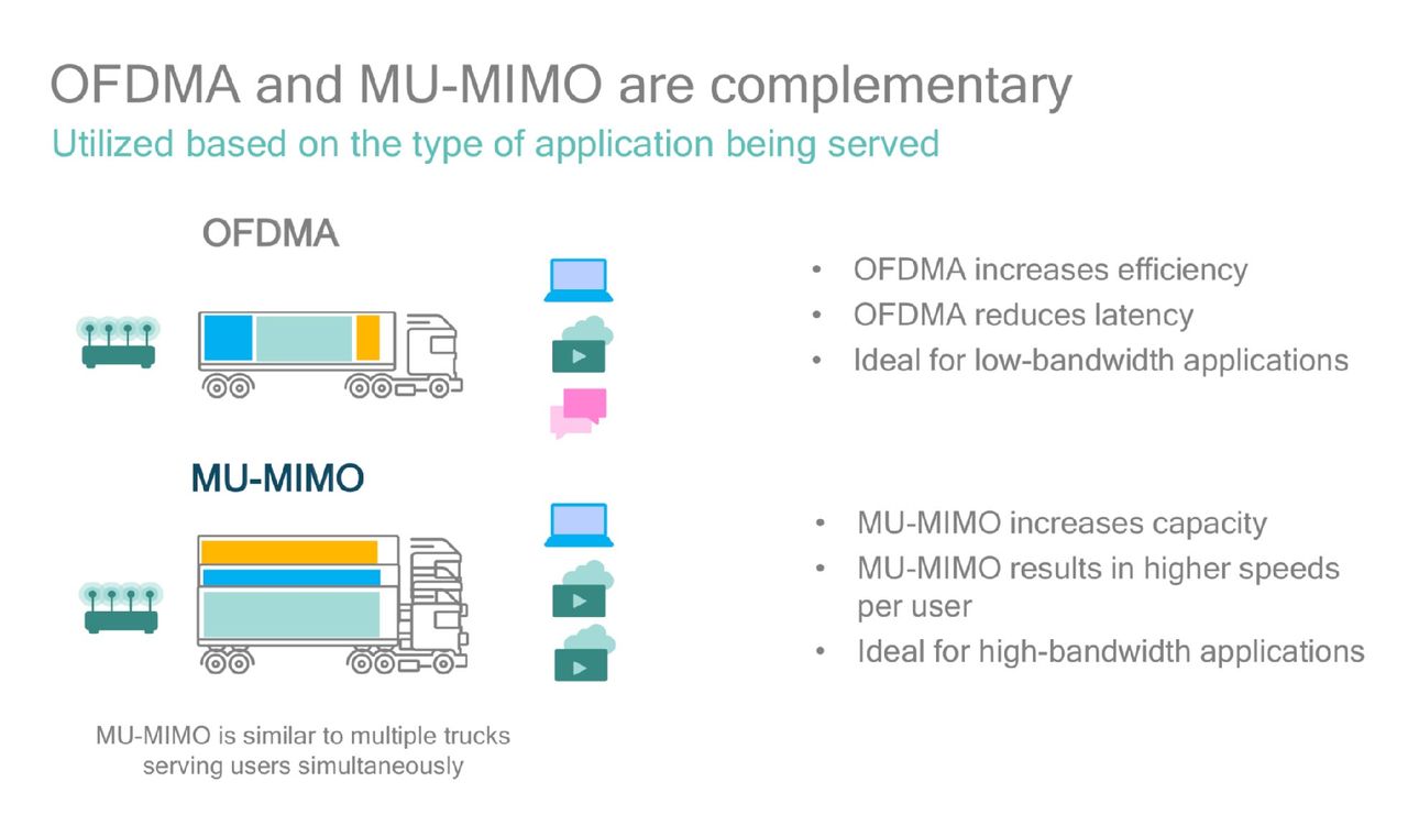 Den strukturerade tekniken med OFDMA blir därför till mycket stor nytta i hårt belastade Wi-Fi-zoner så som tex. Kontor och flerlägenhetshus där väldigt många enheter slåss om accesspunktens uppmärksamhet och begränsade bandbredd.En annan positiv aspekt av OFDMA är att med den strukturerade trafiken i underkanaler skapar ett mer städat utrymme i luften vilket också bidar till bättre räckvidd. Tidigare har vi behövt byta kanal till en mindre trafikerad för bästa möjliga mottagning och prestanda, men med OFDMA och underkanaler så finns det helt plötsligt mer plats och ordning och reda i ett redan hårt trafikerat Wi-Fi-utrymme.OFDMA och MU-MIMO i kombination för snabb och effektiv anslutning