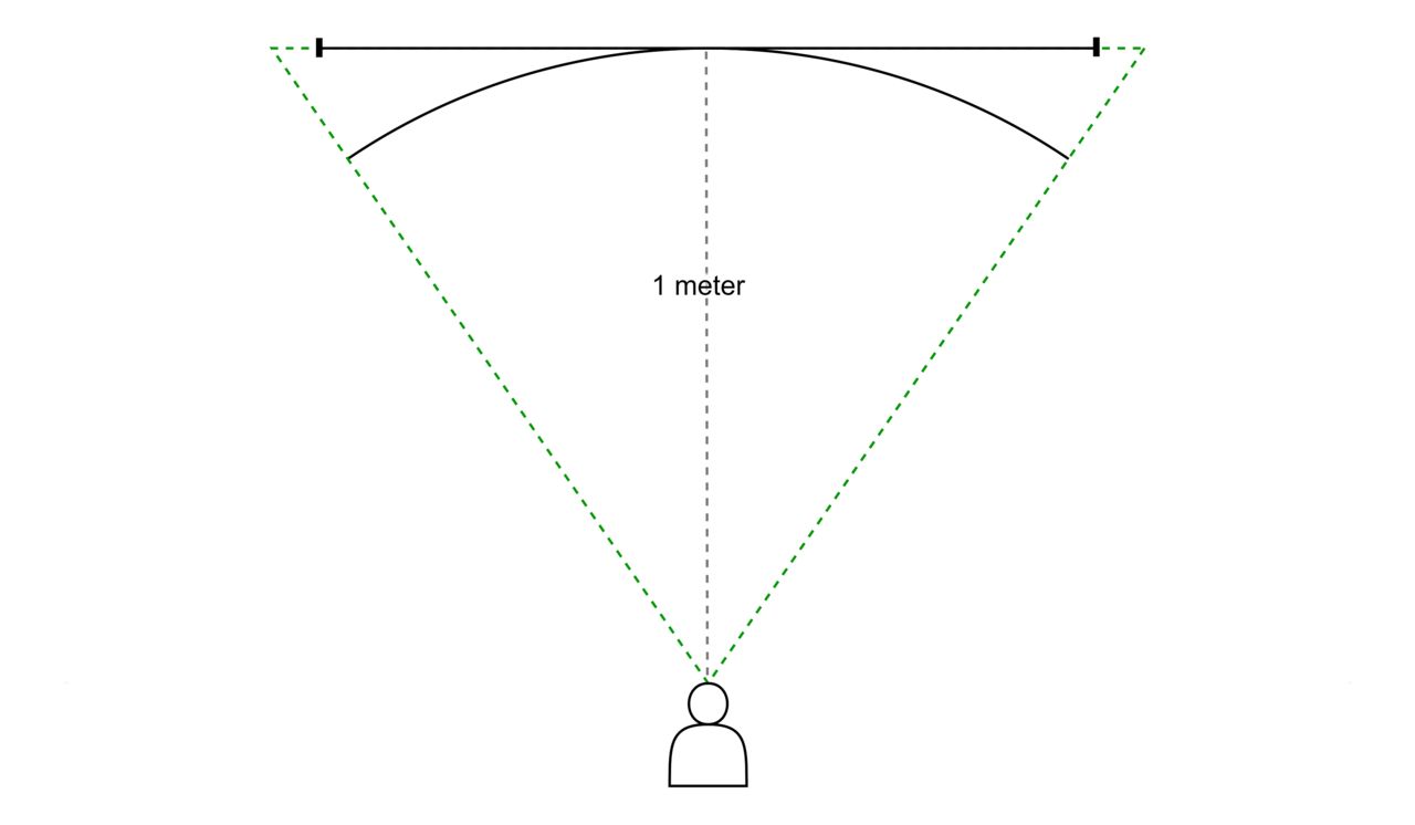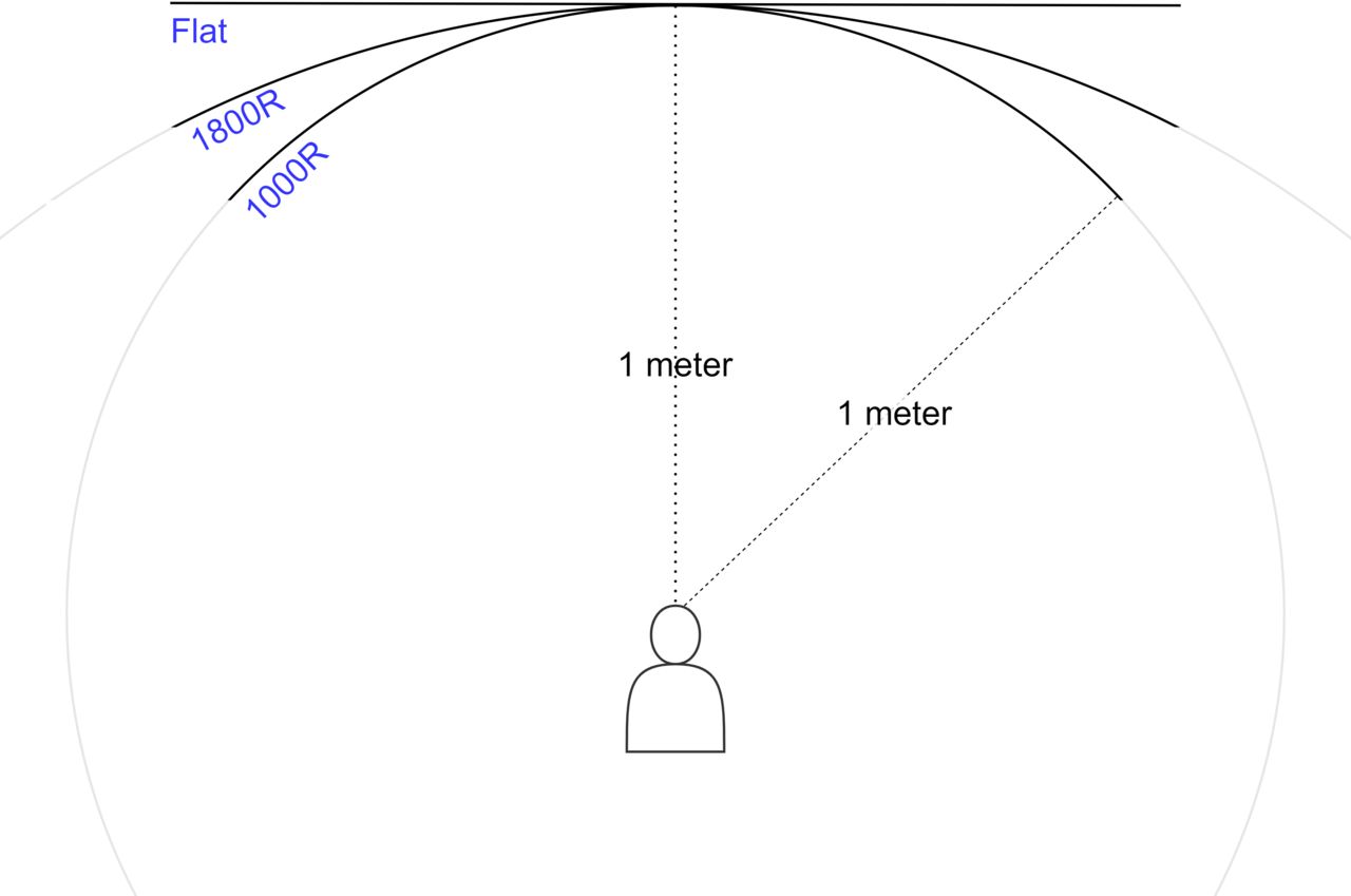 I specifikationerna hos en välvd skärm är det vanligt att se dess kurvatur specificerad som ett R-tal, exempelvis 1800R eller 1000R. Vad det talet berättar är radien på en cirkel med samma kurvatur som skärmen, mätt i millimeter. Till exempel, en skärm med en kurvatur på 1800R har en panel som är byggd efter formen på en cirkel med en radie på 1,8 meter. En illustration av hur kurvaturen på skärmar fungerar vid standardavståndet 1 meter.Det gör det enkelt att avgöra den perfekta kurvaturen på en datorskärm, nämligen avståndet i millimeter. När du sitter 1,8 meter från en skärm med 1800R kurvatur så är alla punkter på panelen lika nära dina ögon. Det är också därför som en kurvatur på 1000R vanligtvis är den bästa för att användas på ett skrivbord, eftersom det är ett typiskt avstånd mellan användaren och skärmen.Med en skärm som har optimal kurvatur på optimalt avstånd upplever du dessutom skärmen som störst, eftersom den täcker maximal andel av ditt synfält. Det illustreras i bilden här nedanför:En 1000R-välvd 49-tumsskärm ser större ut än en platt 49-tumsskärm på samma avstånd. I exemplet används en panel som är 49 tum (cirka 125 cm) på diagonalen. När du sitter på 1 meters avstånd kommer en 1000R-välvd skärm ta upp en större del av synfältet än en motsvarande platt skärm, och därför se större ut. Att välja optimal kurvatur spelar därför stor roll när du ska byta skärm.