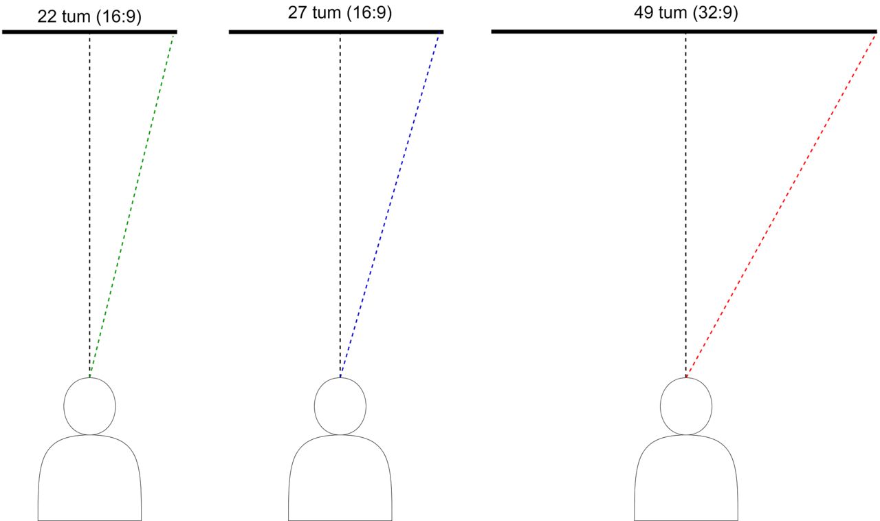 Förbättringar i skärmteknik och kraftfullare grafikkort har lett till att datorskärmar idag är betydligt större än för 10-15 år sedan – allt fler kan unna sig en större skärm och driva den med godtagbar prestanda i moderna spel. Det innebär också att skärmarna har blivit så pass stora att en bra användarupplevelse behöver ta hänsyn till hur det mänskliga synfältet fungerar.Visste du att… De första datorskärmarna var baserade på analoga TV-apparater, som i sin tur byggde var nära besläktade med oscilloskop. I dessa klassiska “tjockskärmar” fanns en elektronkanon som avfyrade en stråle med negativt laddade elektroner mot en yta som behandlats med fosfor. Detta får fosforn att lysa, och med hjälp av magneter flyttas elektronstrålen i en svepande rörelse som, när den sker tillräckligt snabbt, ritar upp en bild för användaren, rad för rad. Svartvita TV-apparater och datorskärmar använde en enda stråle – för att kunna visa färger behövdes tre separata strålar med olika frekvenser som fick fosforn att lysa i var och en av de tre grundfärgerna rött, grönt eller blått. I platta LCD-skärmar finns det istället en ljuskälla som lyser med vitt ljus (antingen med hjälp av lysdioder eller med ljusrör) på en panel med pixlar i form av flytande kristaller. Genom att stimulera kristallerna elektriskt filtrerar de bort vissa våglängder (och därmed färger) av det vita ljuset och släpper igenom andra, vilket ger en färgbild. I OLED-skärmar, vilket används flitigt bland annat i mobiltelefoner, är istället varje pixel sin egen ljuskälla med en röd, en grön och en blå lysdiod. Samsung Odyssey G9 använder den senaste generationens LCD-teknik från Samsung som kallas QLED. Det är en teknik som använder så ett lager nanopartiklar som kallas kvantpunkter utöver lagret med flytande kristaller. Kvantpunkterna reagerar när de utsätts för ljus och utsöndrar eget ljus med specifika våglängder, för att förstärka färgerna som panelen kan visa.Vanligtvis sitter vi ungefär en meter från datorskärmen på skrivbordet. På en mindre skärm, exempelvis på 22 tum, är alla delar av skärmytan ungefär lika nära användaren. Text som du läser längst ut till vänster på skärmen ser alltså ungefär lika stor ut som samma text placerat i skärmens mitt. Men ju bredare skärmen blir, desto mer ökar skillnaden i avståndet till ditt öga. Bilden här nedanför illustrerar den skillnaden mellan olika skärmstorlekar.En bildskärm i 16:9-format på 22 tum har exempelvis en bredd på ungefär 50 cm. Om du sitter en meter från skärmen så är skärmens mitt exakt en meter ifrån dig, men skärmens höger- och vänsterkanter är cirka 103 cm från dig — inte en särskilt stor skillnad. Men en platt ultrabred 32:9-skärm har istället en bredd på cirka 120 cm, vilket innebär att vänster- och högerkanten är 16 cm längre bort från dina ögon än vad mitten är, en skillnad på 16%. Det är en storleksordning som på allvar börjar påverka skärmens läsbarhet och din inlevelse i spel och filmer. Det kan också vara mer ansträngande för ögonen vid lång användning, eftersom fokusavståndet är annorlunda mellan skärmens mitt och dess kanter.Det finns två sätt att motverka den här effekten för stora skärmar: antingen genom att sitta längre ifrån skärmen, vilket också ger dig en upplevt mindre bild, eller genom att använda en välvd skärm som för kanterna närmare dig. Av dessa två alternativ är det alltså den välvda skärmen som gör att du får ut mest av din skärmyta.
