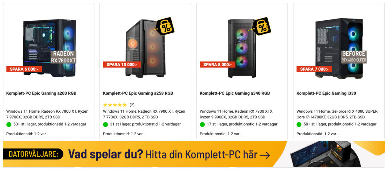Spel kräver allt bättre hårdvara samtidigt som suget efter högre fps är ofrånkomligt. Inför vinterns stora spelsläpp kan du slå två flugor i en smäll med en färdigbyggd dator från Komplett som just nu kommer med en rejält kapad prislapp.Besök Komplett för grymma erbjudande på gamingdatorer och tillbehör!Att bygga sin egen dator kan vara riktigt spännande. Det kan vara otroligt frustrerande och det är aldrig helt riskfritt. Det kan också vara svårt att veta exakt vilka delar i datorn som behövs för att julledigheten ska bli fylld med så mycket fantastisk gaming som möjligt. Komplett firar därför in vintern med en kampanj på färdigbyggda datorer där du kan spara upp till 10 000 kronor på en Komplett-PC.Minimera strul med Komplett-PC: - Alltid tre års garanti på datorerna om olyckan är framme. - Ingen bloatware, inga onödiga förinstallerade program som sänker prestandan. - Byggd med standardkomponenter, samma som entusiasterna använder. - Handbyggda och anpassningsbara. Få din dator med hårdvaran DU vill ha.Söker du inte en hel dator? Komplett har även grymma deals på utvalda komponenter och utrustning som grafikkort, datormöss, skärmar och VR-headsets!