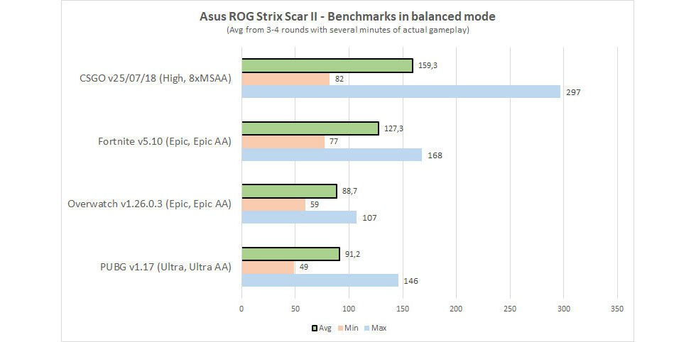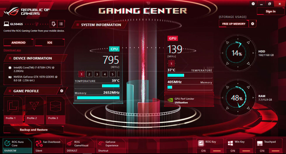 ROG Strix Scar II är en gaminglaptop med FPS-spelare i fokus som utrustats med en Intel Core i7 av åttonde generationen med 6 kärnor som ger hastigheter upp till 4,1 GHz. Det ger dig tillräcklig prestanda för att spela alla dagens tunga speltitlar utan kompromisser, med sikte på framtiden.En Nvidia GTX 1070-krets i en bärbar dator är ingen nyhet men skillnaden med ROG Strix Scar II är att den huserar en ostrypt laptop-version av kretsen som har högre klockfrekvenser jämfört med tidigare Max-Q-varianter. Allt för att du ska kunna driva dagens populäraste spel, och det i hög FPS.För de gångerna du inte spelar utan bara vill ha lugn och ro så kan fläktarna på ROG Strix Scar II enkelt sättas till Silent Mode. Klicka bara på ROG-knappen på tangentbordet för att starta Gaming Center och välj fläktprofil via Fan Overboost. Så slipper du störa stolsgrannen på tåget eller klasskompisen i biblioteket.