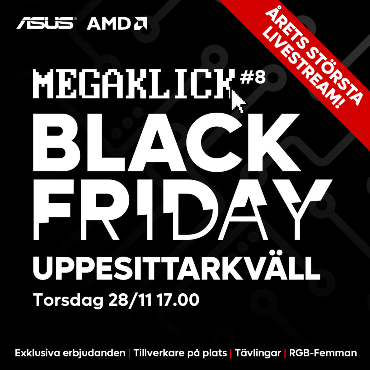 Nu är det äntligen dags för årets största kampanj, och årets största stream med uppesittarkväll. Vi kommer slå på den stora trumman med en kavalkad av fynd och trevliga överraskningar som vi tror att du kommer vilja ta del av. Vi vet att Black Week kan kännas lite utdraget, men vi vill verkligen att ni ska hinna med att handla prylarna ni älskar, samtidigt som vi vill hinna ge er vår bästa REA på hela året!