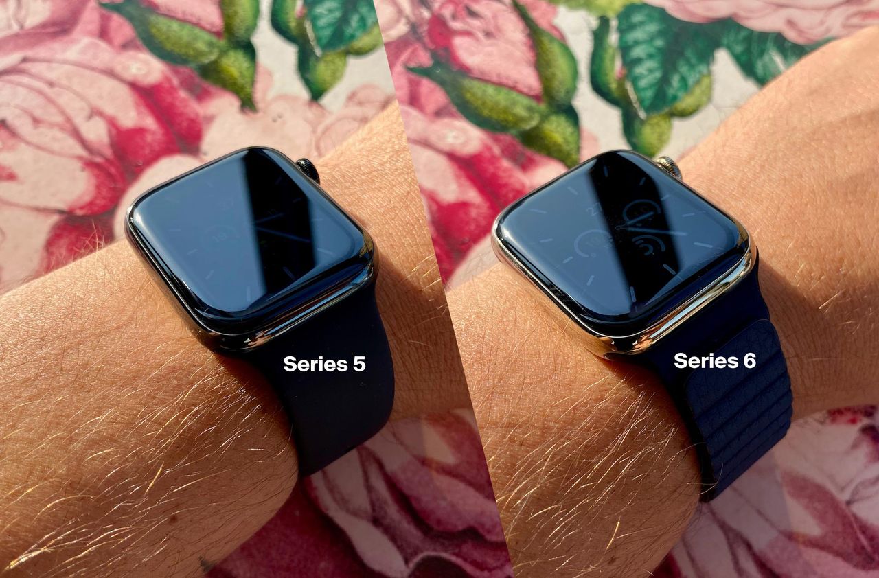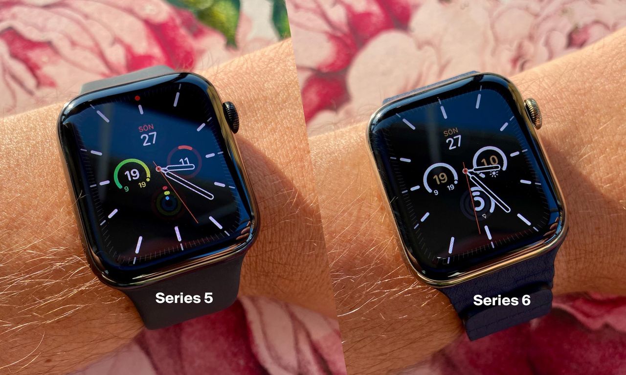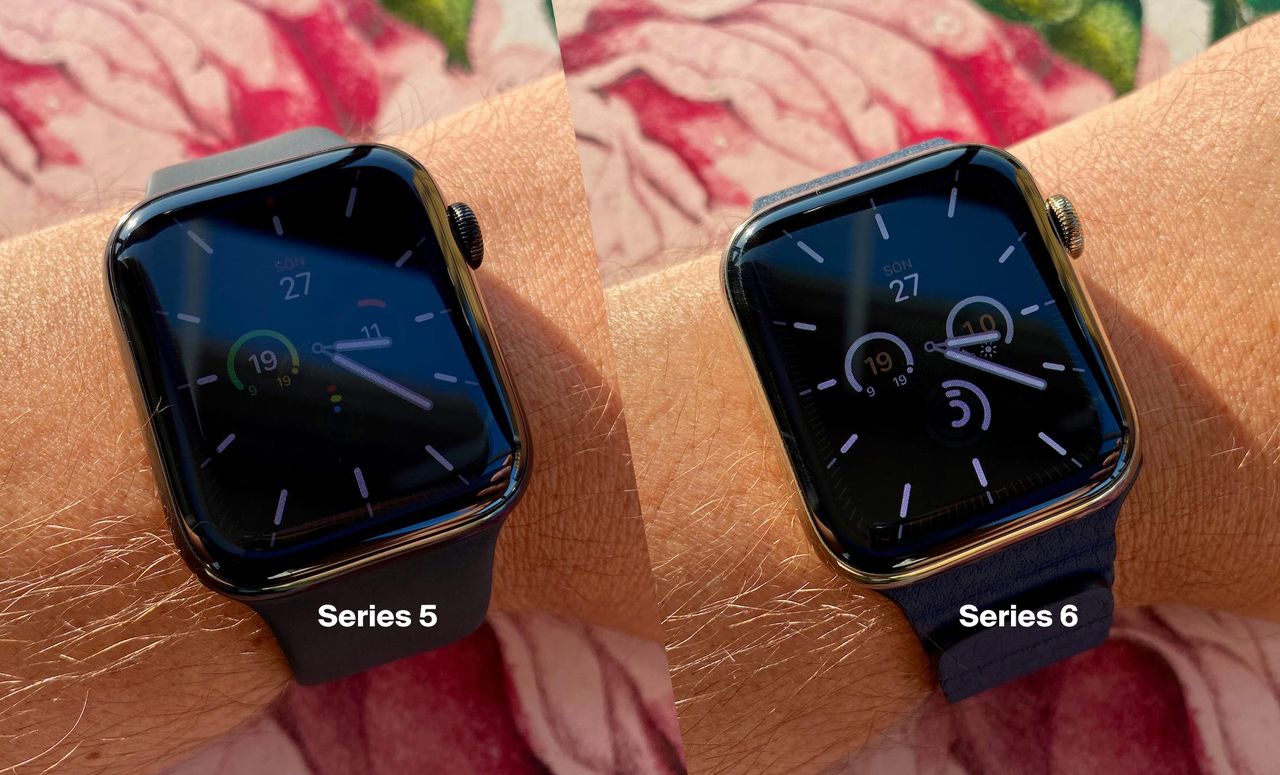 Skärmen är lika stor och har samma form som förra året, men har mer drag i sig. Det här gör främst skillnad i always-on-läget när man är utomhus. Förra årets skärm levererade 200 nits i det här läget och årets 500 nits. När man är inomhus gör detta inte någon större skillnad alls faktiskt. Anledningen till det är att om det inte är så ljust så behöver inte skärmen leverera så många nits för att det ska vara behagligt. Utomhus däremot är skillnaden betydligt större. I indirekt solljus ser man verkligen skillnaden och i direkt solljus är Series 5 i princip svart. Förändrar detta ditt liv? Knappast, men en trevlig nyhet helt klart.