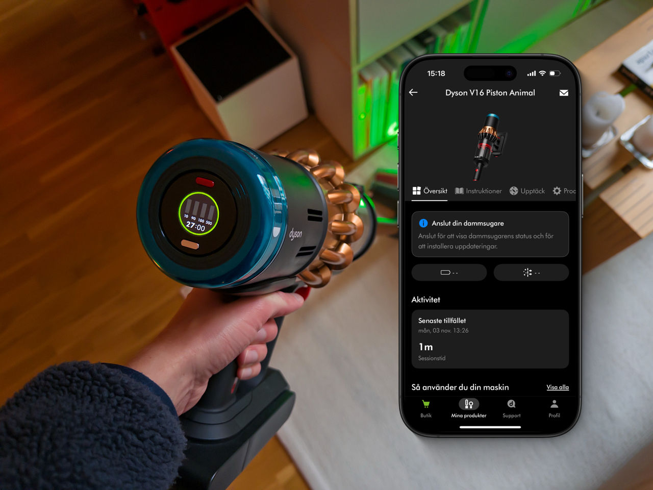 V16 kan anslutas till MyDyson-appen, men för mig kändes det mest som en gimmick och inte något man faktiskt aktivt behöver använda – på gott och ont. Appen är till för att ge mig underhållsvarningar, som när jag behöver tvätta filtret, och jag kan se guider och justera vissa inställningar. Men jag vill bara att mina golv ska bli rena, jag känner inte alltid något jättebehov att grotta ner mig kring min städning. LCD-skärmen på dammsugaren kan förresten visa partikeldata live, vilket är en kul grej de första fem minuterna, men det tillför inget verkligt värde för mig i vardagen.