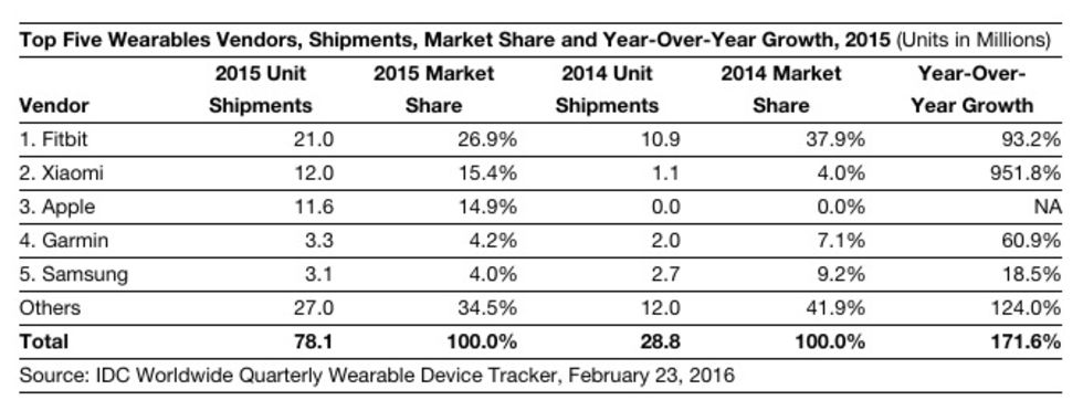 Analysföretaget IDC har släppt en rapport över hur många wearables, ett segment som räknar in både aktivitetsarmband och smartklockor, det såldes i världen förra året och totalt såldes det 78,1 miljoner wearables under 2015 vilket är en ökning med 176,1% jämfört med de 28,1 miljoner som såldes under 2014.Marknadsledaren inom wearables är för tillfället Fitbit som förra året sålde 21 miljoner wearables vilket är 26,9% av hela marknaden och en uppgång med 93,2% för Fitbit jämfört med 2014. Raketen i statistiken är dock Xiaomi som levererades näst mest wearables under 2015 med sina 12 miljoner enheter. Det är en ökning för Xiaomi med hela 951,8% jämfört med de 1,1 miljoner enheter man levererade under 2014.En annan raket är Apple och dess Apple Watch som gick från att att ha 0% av marknaden 2014 till att ta en tredjeplacering i statistiken med 14,9% av marknaden och 11,6 miljoner levererade Apple Watch under förra året. Efter Apple kommer Garmin som trots att de ökat sina leveranser med 60% från 2014 tappar marknadsandelar och går från 7,1% 2014 till 4,2% under förra året med sina 3,3 miljoner levererade enheter.På femteplatsen hittas Samsung och de har ökat sina leveranser av wearables med 18,5% jämfört med 2014 men även de tappar marknadandelar och går från att ha haft 9,2% av wearablesmarknaden 2014 till att förra året bara ha 4% av marknaden med sina 3,1 miljoner levererade enheter. Tabell: IDC