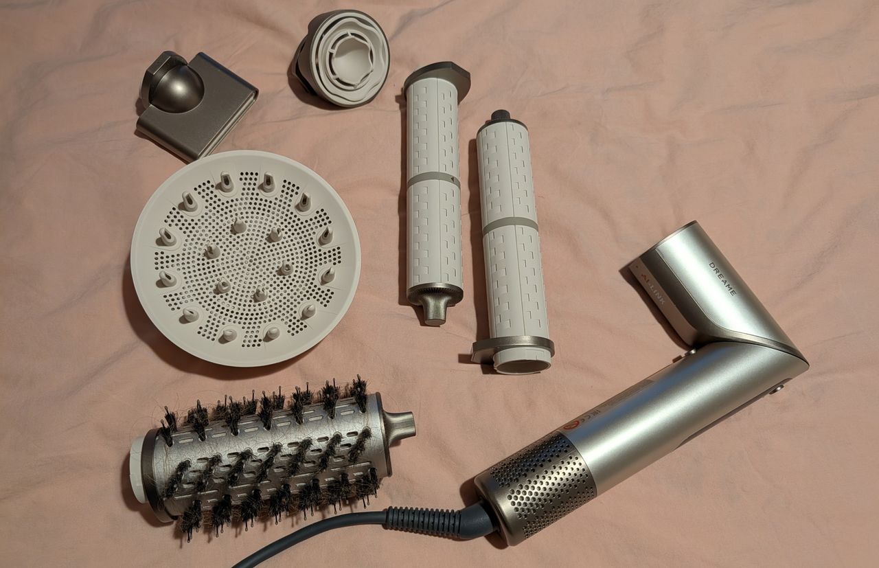Går vi vidare till håret så är Dreame Dazzle en sådan där pryl som försöker göra allt på en gång. Vår testare gillade att den faktiskt lyckas ersätta flera verktyg i badrumsskåpet och tar håret från blött till stylat på nolltid. Stylern känner själv av vilket av de fem munstyckena som sitter på och anpassar värmen därefter. Borstläget, som borstar och torkar samtidigt, sparar dyrbara minuter på morgonen medan locktångs-funktionen kräver lite mer handlag men levererar fina resultat när man väl fått in snitsen. Det enda vi saknade var en medföljande förvaringsväska för alla delar. Priset landar på 3 990 kronor.Många tillbehör men ingen väska att ha dem i.