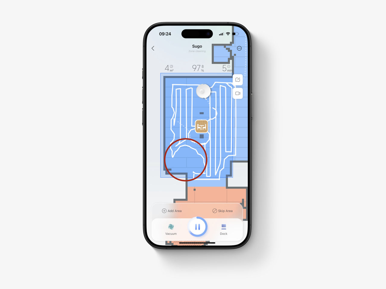 Sugkraften för dessa robotar, i maxläget, ligger på 18.500 Pa. Det är bland de högsta på marknaden – så hur märks det i vanlig städning? I mitt hem gör det inte det. Redan med tidigare robotar blev mina golv rena och dammfria. Möjligtvis kan denna suga upp större stenar i hallen, om du bor någonstans där det kommer in mycket grus.Borsten har också fått en ny tvådelad design, som Roborock säger ska undvika att hår fastnar och trasslar in sig i borsten. Efter cirka två veckor hittar jag fortfarande inga hårstrån i borsten, så den verkar fungera någorlunda bra iallafall.Något som jag dock ibland uppfattat som ett steg tillbaka är navigationen, som på pappret ska vara bättre på att undvika sådant som skor, sladdar och andra prylar på golvet. Visst gör den också detta, men det finns tillfällen där roboten tappat bort sig helt och hållet och helt enkelt inte dammsugit på en tom golvyta. Det har jag inte varit med om med mina äldre robotdammsugare. Det går att ställa in i appen om du vill att roboten ska vara mer aggressiv eller undvikande, så om du inte har något emot att den stöter in i grejer så finns även det alternativet.Här missade den trots tomt golv.Moppdelen består, precis som hos tidigare modeller, av två roterande moppar. En av dessa är, precis som hörnborsten längst fram, utrustad med en robotarm som ska komma åt hörn bättre. Vid avslutad städning rengörs dessa i dockningsstationen i upp till 75 grader.