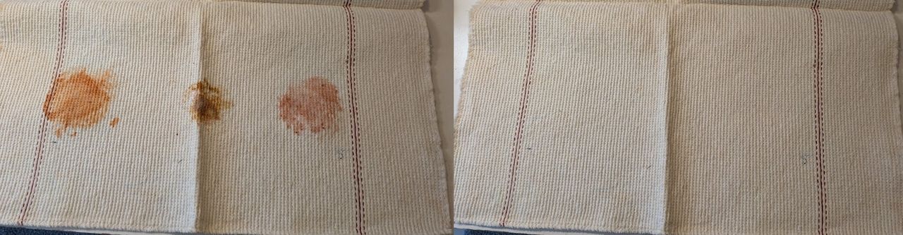 Maskinen är, som sagt, lätt att använda och gör dessutom ett bra jobb för sin storlek. Den är effektiv på att ta bort lättare fläckar, men kan behöva flera omgångar för att hantera riktigt ingrodda smutsfläckar. Då är det viktigt att låta rengöringsmedlet verka en stund innan man börjar suga upp det. Den lyckades till exempel få bort en del lagom ingrodda fläckar som jag egentligen redan hade gett upp hoppet om. Sugförmågan är bra, men det blir aldrig helt torrt, så lite lufttorkning krävs innan man kan sätta sig igen.Men det är inte bara synliga fläckar man behöver ge sig på, man kan köra den om man bara vill fräscha upp sina textilier lite. Jag körde den till exempel på några stolar här hemma, och vattentanken visade att de var mycket smutsigare än vad de såg ut.Ketchup, soja och sylt innan och efter fläckrengöraren (sylten krävde dock en extra körning).När det gäller underhållet känns det som att Philips har tänkt till. Det är enkelt att hålla maskinen fräsch mellan användningarna. Så länge man spolar rent smutsvattenbehållaren efter varje gång slipper man intorkad smuts och tråkig lukt. Rengöringen går snabbt och smidigt. Det finns också en funktion som spolar igenom slangen automatiskt efter användning för att hålla den ren. Denna funktion är dock inte så avancerad som den låter då den går ut på att köra maskinen med ett lock på munstycket så att rent vatten rensar slangen. På tal om munstycket hade jag gärna sett att det kunde rotera runt slangen istället för att vara fast, eftersom slangen annars spänns lite i vissa vinklar.Designmässigt är maskinen både kompakt och stadig, med en höjd på bara 32,5 cm. Det gör att den lätt får plats i städskåpet utan att ta för mycket plats.Summa summarum: om du har barn som envisas med att spilla på soffan, husdjur som inte kan låta bli att smutsa ner sängen eller bara är trött på att leva i symbios med gamla fläckar, så är detta en pålitlig liten hjälpreda. Den gör jobbet snabbt, effektivt och utan allt för mycket krångel.Samtidigt är det inte något man använder särskilt ofta, så även med sitt kompakta format är det inget man måste ha i städskåpet. Men det är väldigt skönt att ha den tillgänglig när olyckan väl är framme. Priset ligger runt 2 000 kronor i butik.