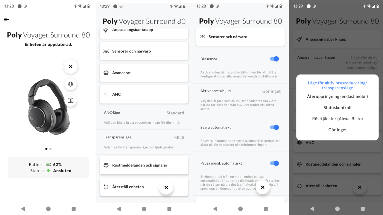 Det finns många fördelar med att ha hörlurarna kopplade till både telefonen och datorn samtidigt, men det medför också vissa problem. Det jag fann mest irriterande var att play/pause-knappen alltid öppnade Teams på datorn när den var kopplad till båda, även om musiken spelades från telefonen. Detta är direkt besvärligt om man vill stänga av musiken och innebär att man måste öppna programmet för att pausa. Om hörlurarna endast är kopplade till telefonen fungerar knappen som den ska.Att växla mellan de olika brusreducerande lägena gör man enkelt via ett knapptryck, men vilket läge man befinner sig i kunde jag endast se i appen. Detta är inte särskilt praktiskt då många av hörlurarnas inställningsbara funktioner ligger flera knapptryckningar bort innan man når dem.Även om headsetet känns gediget och skönt att ha på sig, så är av- och på-knappen ganska tråkig. Den är väldigt liten och ger inte någon form av tillfredsställande känsla när man aktiverar den.