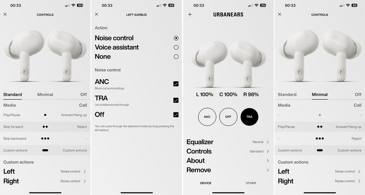 Hörlurarna är försedda med touch-kontroller vars funktionalitet delvis går att ställa in via Urbanears tillhörande app. Det går bland annat att växla mellan olika kontrollscheman, något som kanske kan vara intressant för dem som inte vill att ett tryck på lurarna ska göra någonting alls. Vidare går det även att ställa in om man vill att långtryck på hörlurarna ska aktivera olika lyssningslägen eller telefonens smarta assistent.