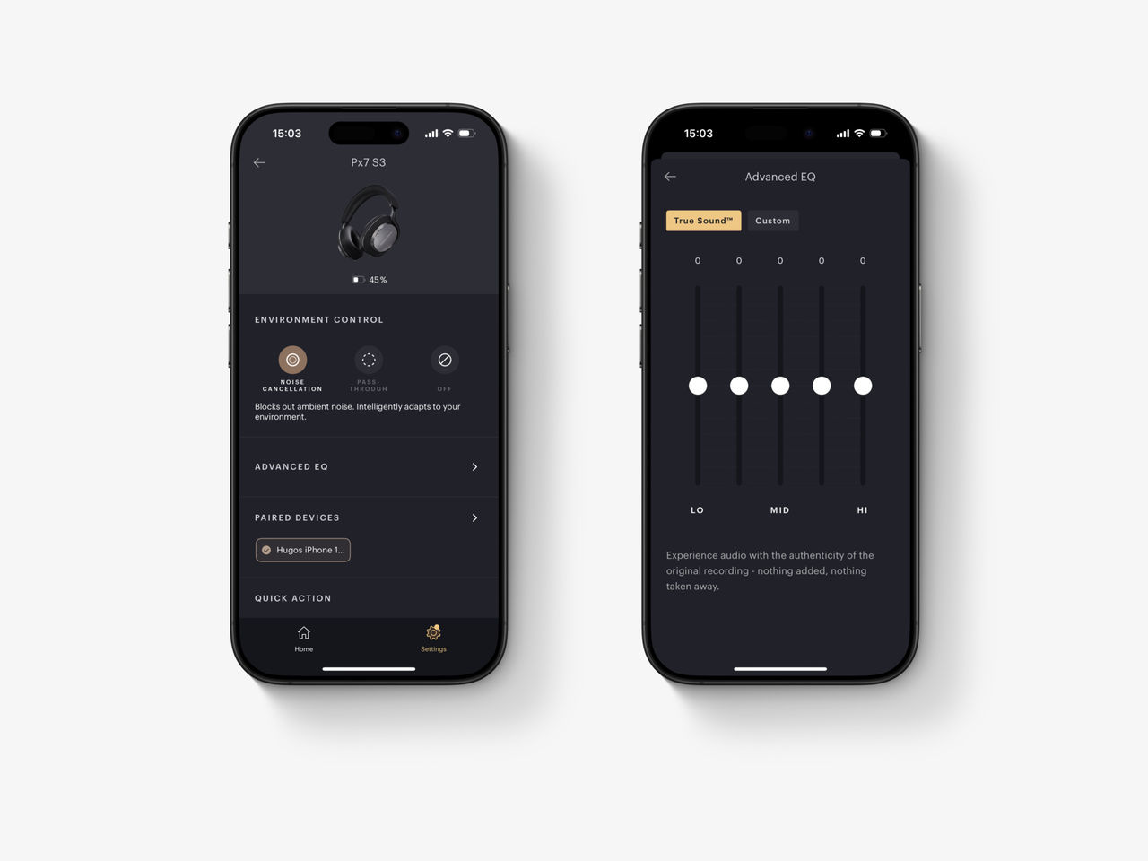 Px8 utstrålar verkligen lyx med sina armar i aluminium och nappaläder. Px7 S3 å andra sidan har en design som kan beskrivas som lite modernare och slankare, i tyg och metall. De är också aningen lättare (ca 307g mot Px8:s 320g). Båda har sama fysiska knappar, men strömknappen har flyttats till andra öronkåpan på Px7 S#. På vilken modell knapparna sitter “bäst” låter jag dock vara osagt. För mig är det mer en vanesak.Px8 är några av de bekvämaste over-ear-lurarna jag testat. Px7 S3 delar vissa egenskaper med sin storebror men är alltså aningen tightare med mindre utrymme för öronen. De klämmer också lite hårdare på huvudet. Inget av detta försämrar komforten för mig särskilt mycket, men det är märkbara skillnader mellan hörlurarna.