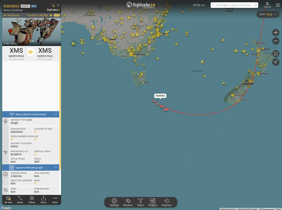 Traditionsenligt håller Flightradar koll på tomten och hans framfart. Just nu befinner han sig på väg in över Tasmanien för att sedan dra upp över Australien. Om man ska tro på detta lär det ta en stund innan han kommer hit till Sverige...