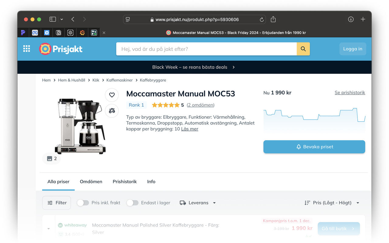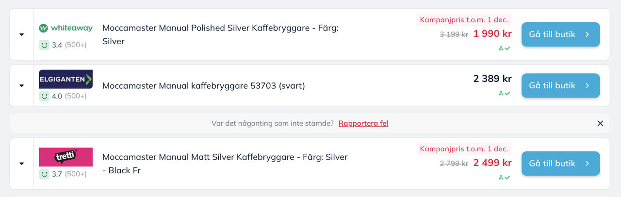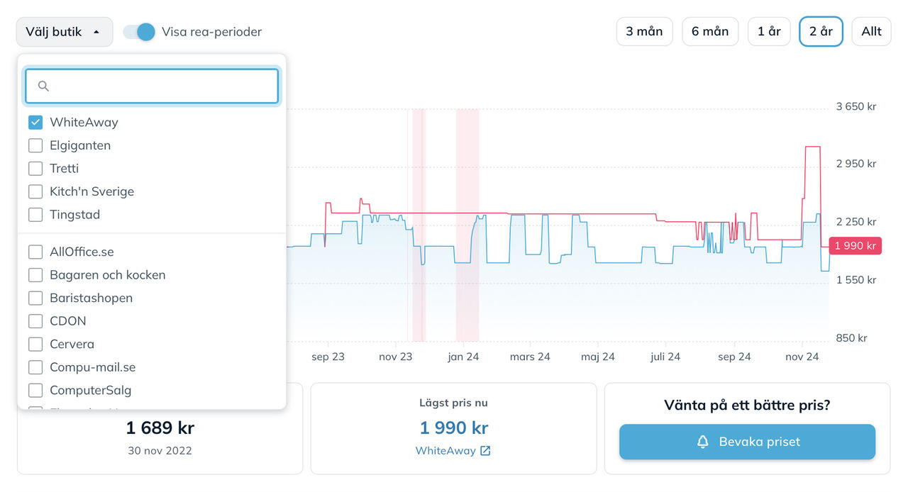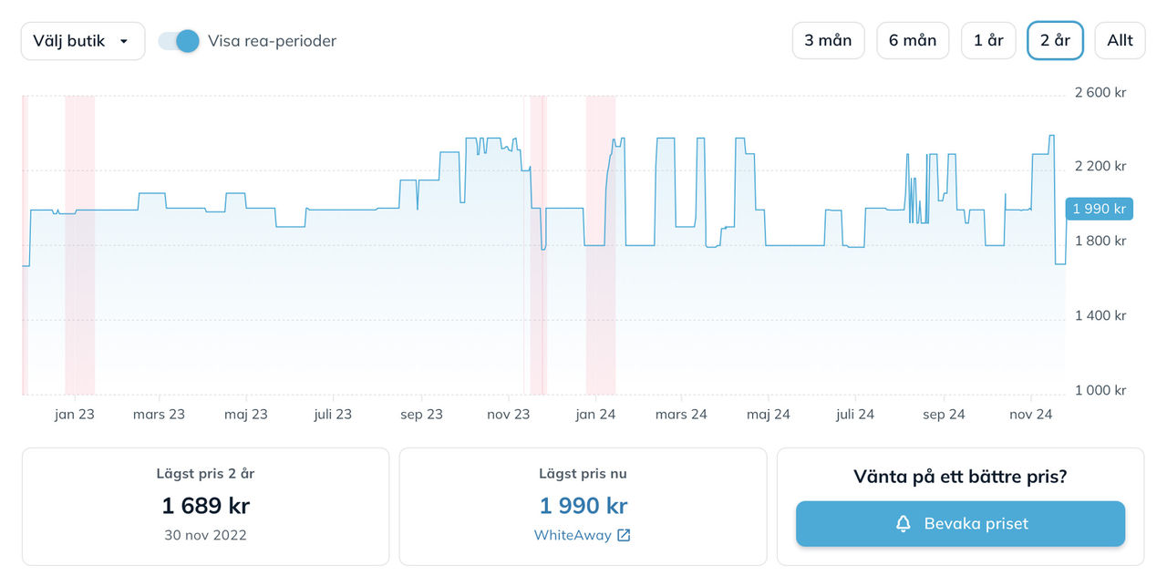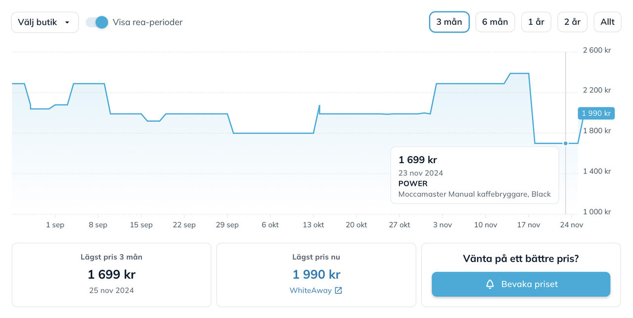 En riktigt, riktigt bra funktion på Prisjakt är att man kan kontrollera priset historiskt. Men de nya reglerna om att man inte får köra prissänkningar när och hur som helst gör faktiskt denna funktion lite yxig, för tre månader tillbaka lär priset i de flesta produkters fall ha varit högre. Det kan alltså på tremånadersvyn för prishistoriken se ut som att reapriset är riktigt bra. Det intressanta tidsspannet är istället hela två år tillbaka. Om vi tar en kaffebryggare från Moccamaster som exempel så kostade den under förra veckan 1699 kronor. Ett bra pris om man tittar på 3-månadersgrafen. På skärmdumpen ovan ser ni en graf uppe till höger och det är denna som alltså är tre månader tillbaka i tiden. Samma sak om vi klickar in oss till prishistoriken. Den hittar ni på varje produktsida hos Prisjakt, bara att klicka på prishistorik, på grafen eller scrolla nedåt. Men klickar vi in oss till 2-årsvyn så ser vi att bryggarens pris har varit nere på ungefär samma nivåer tidigare. Vi kan i den här grafen se att den flera gånger tidigare har kostat 1799 kronor, vilket ju är något mer än 1699 kronor men det gör knappast 1699 kronor till ett unikt pangpris. De röda delarna i grafen är förresten reor, riktigt bra av Prisjakt här för det gör det tydligt att se om varan brukar reas på reorna eller mest hela tiden. Personligen tycker jag att det är ok att rea ut vissa saker under vissa perioder på året, men flyger priset jojo under hela året ska man dra öronen åt sig. I det senare fallet är det troligen så att man höjer priset under perioder för att kunna ha det som lockvara. Priset på 1699 kronor är dock inte längre det lägsta, Power som erbjöd det priset har helt enkelt slut på bryggare och det går inte att köpa varan från dem till det priset längre. Lägst just nu är istället Whiteaway som tar 1999 kronor för kaffebryggaren. I listningen på Prisjakt står det att det är ett kampanjpris och att de tidigare tog 3199 kronor för bryggaren, samma sak står på deras hemsida. Att Prisjakt skriver ut 3199 kronor i listningen är faktiskt riktig dåligt, för om vi går tillbaka till prishistoriken så kan vi välja att se hur specifikt Whiteaway har hanterat priset. Välj bara Whiteaway som butik under "Välj butik". Där kan vi på den röda linjen se att kaffebryggaren hos Whiteaway det senaste året har kostat runt 2300-2400 kronor och att man chockhöjde priset så sent som i början av november. Riktigt fult med andra ord. Det ska sägas att jag behövde leta en stund för att hitta ett fulexempel som detta och att de flesta butikerna sköter sig, men grundregeln att butiker inte sköter sig ska nog ändå ska följas. Var inte godtrogen, kolla upp prishistoriken och syna eventuella bluffar.