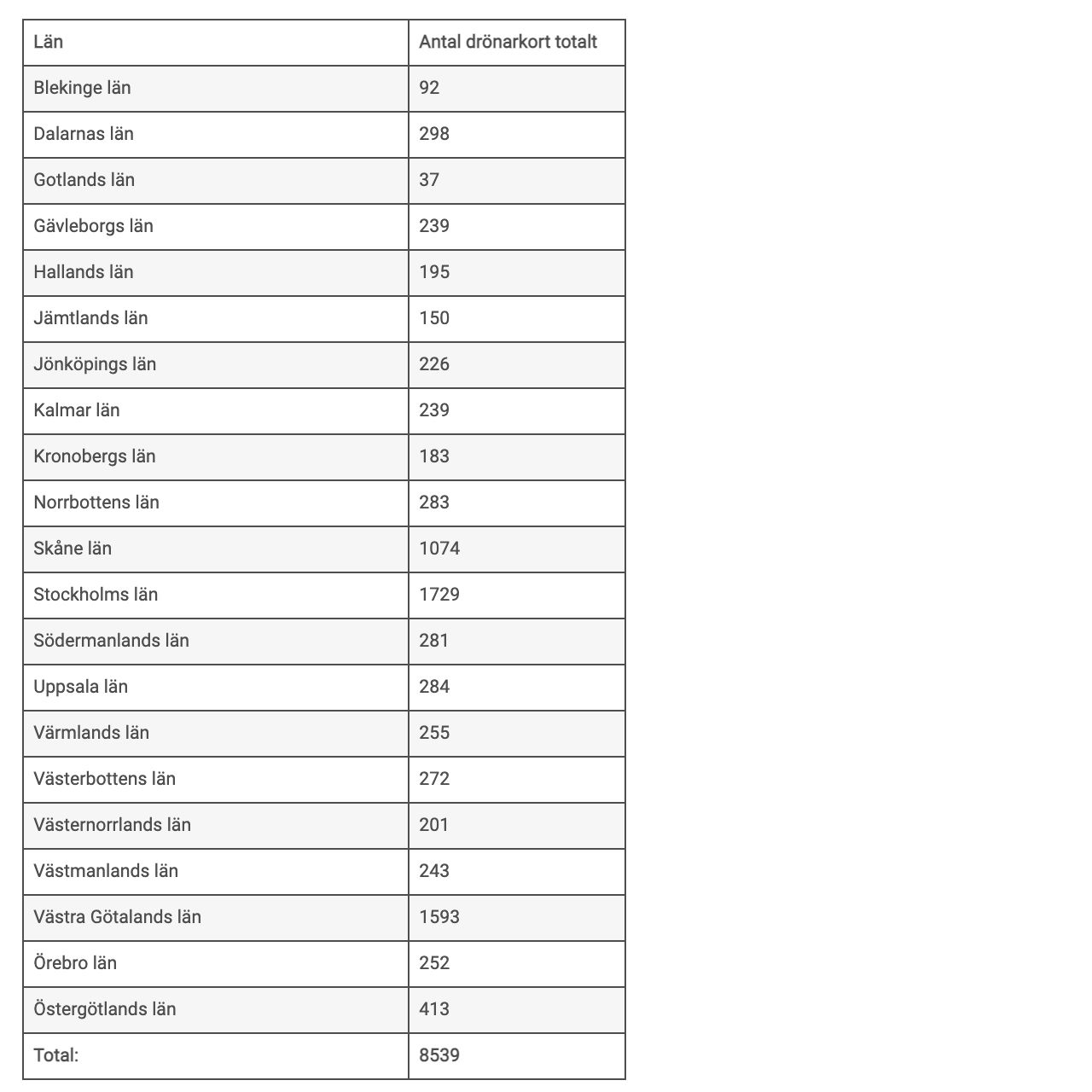 Här nedanför kan ni kolla in hur många drönarkörkort som utfärdats i respektive län. Tabell: Transportstyrelsen
