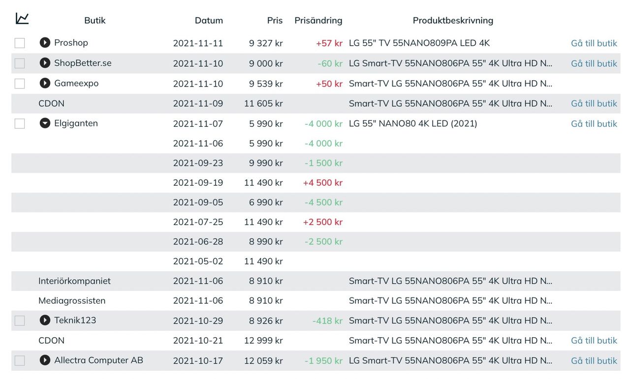 Nu börjar rea-säsongen för 2021, i dag med singles day som är ett extremt stort event i Kina men inte så mycket här i Sverige. Sedan kommer så klart Black Friday (som blivit black week) och efter det cyber monday. På dessa reor så brukar handlarna visa upp en massa varor med enorma prissänkningar, eller i alla fall vad som ser ut som enorma prissänkningar. Men hur vet man om det verkligen är riktiga prissänkningar eller hittepå?Vi tar den här tvn från LG som säljs av Elgiganten. Den kostar nu 5995 kronor och Elgiganten säger att det är 4000 kronor rabatt på den. Nu ska vi se om det verkligen stämmer. Vi börjar med att gå in på Prisjakt och söker efter namnet på tvn, i det här fallet NANO80. Sökresultatet säger att det finns ett gäng storlekar, vi letar efter 55-tummaren. Tv-tillverkarna har börjat använda samma kod men uppdatera den så att det finns en 2020-modell och en 2021-modell. I det här fallet finns det bara en 2021-modell, men Samsungs The Frame finns i olika årgångar så håll koll på detta så att du inte köper 2020-varianten men tror att det är 2021-varianten. Klickar vi oss in till 55-tummaren så ser vi att Elgiganten är billigare än de andra som säljer samma tv, men är det billigt för det? När vi klickar oss in till Prishistoriken ser vi några intressanta saker. Dels när den började säljas, i det här fallet i april förra året. Alltså ingen lastgammal modell, men inte årets. Sen ser vi att den började på 14.990 kronor och kostade så i några månader. Tv-tillverkarna går ofta ut med ett högt pris som sedan sänks drastiskt så det är inte alltid något bevis på att det är en dyr produkt som just nu är ett kap, framförallt inte när priset som i det här fallet snabbt rasade till hälften efter den ursprungliga prisnivån. Elgiganten vill alltså ha 5990 kronor nu och säger att tvn har kostat 9990 kronor, men här ser vi att den (hos andra handlare) har kostat runt runt 8000 kronor ett tag och sedan runt 7000 kronor en längre tid, som lägst 6600 kronor. Senaste månaden har priset återigen ökat lite, som av en slump. Men ljuger Elgiganten om sin prissänkning? Längre ner på sidan ser vi en lista med prisförändringar och klickar vi på den lilla pilen vid Elgiganten så ser vi att man har sänkt och höjt priset ett gäng gånger i år. I september reade man ut den till priset 6990 kronor. De har alltså mycket riktigt sänkt priset från 9990 kronor till 5990 kronor men om det är 4000 kronor rabatt när tvn har gått att få för 6600 kronor en längre tid tål att diskuteras. Prishistoriken är alltså din vän om du kollar in produkter som du inte har haft koll på sedan tidigare! Disclaimer: Feber samarbetar med Prisjakt men den här artikeln är inte skriven på uppdrag av dem.