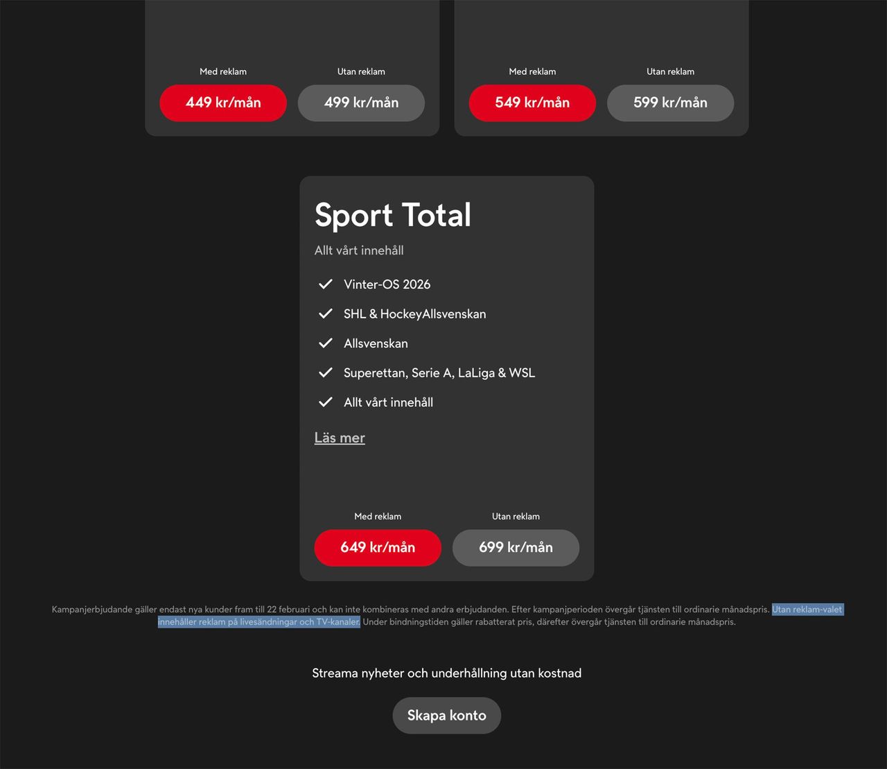 TV4 säljer en massa innehållspaket och man säljer dem med och utan reklam. Hur mycket man betalar för att slippa reklamen är lite olika från paket till paket, men mellan 50 och 100 kronor extra kostar det. Att TV4 kan lösa en reklamfri upplevelse där deras egen reklam mellan program inte trycks i ansiktet på användaren, det är inte så konstigt. Men kommersiella budskap finns både här och där, till exempel under OS finns det ju en massa olika sponsorskap som vävs in i sändningarna. Och det står mycket riktigt en liten, liten, liten disclaimer om det på sidan för paket. "Utan reklam-valet innehåller reklam på livesändningar och TV-kanaler. "Ser ni den markerade texten?Konsumentverket har fått in 16 anmälningar under ett år, vilket inte verkar vara tillräckligt för att skapa ett tillsynsärende. Men Konsumentverket påpekar till SVT att all marknadsföring ska vara sann och inte vilseledande. – Reklam förekommer i samtliga av våra livesändningar och tv-kanaler, något vi informerar om i köpflödet för våra abonnemang och på vår hemsida. Samtidigt tar vi till oss den feedback vi fått från våra användare och ser över hur vi kan göra detta ännu tydligare framåt, säger TV4 i en kommentar till SVT.Vad tycker ni, är det ok att säga "utan reklam" istället för "mindre reklam" och tjänsten är i stort sett reklamfri?