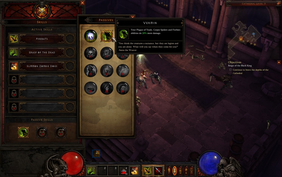 En annan sak som har ändrats är det ökända potionslurpandet. Den som har spelat mycket Diablo II vet med sig hur viktigt det var att hälla i sig floder utav röd vätska för att inte dö under tuffare strider. I Dibalo III kan du bara använda en potion var 30:e sekund, men som kompensation kan fiender tappa health globes som fyller samma funktion direkt när man rör vid dem. Dessutom kan två av spelets sex klasser, Witch Doctor och Monk, specialisera sig på att hela sig själva och sina gruppmedlemmar, vilket kan komma att behövas för att klara spelets svårare utmaningar.