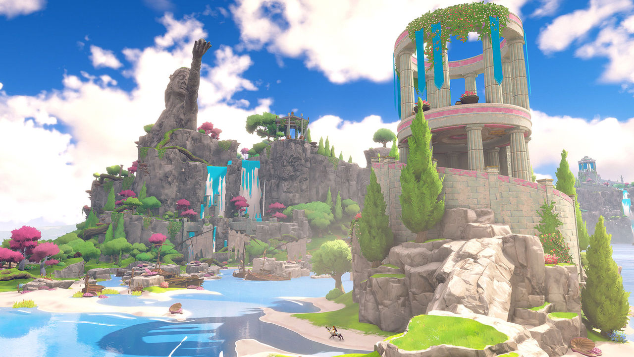 Upplägget är nästan identiskt med Breath of the Wild och helt ärligt känns det som att någon Ubisoft-chef lirat Nintendos mästerverk och sagt till Assassin’s Creed: Odyssey-utvecklarna: ”Gör ett sånt spel, tack. Fast med Ubisoft-känsla!” Likheterna märks av så fort man startar spelet. Precis som när Link vaknar upp i startområdet Great Plateau får vi i Immortals starta i ett litet område för att lära oss slåss, navigera och lösa pussel. Därefter får vi börja utforska resten av världen. Till skillnad från Breath of the Wild håller Immortals spelaren i handen under spelets gång. Berättarrösterna Zeus och Prometheus berättar ständigt vad Fenyx ska härnäst, vilket gör att man inte får samma härliga tillfredsställande utforskarkänsla man får i Breath of the Wild. I och med att Fenyx kan hitta praktiskt taget allt med sin kikare, så är det inte lika exalterande att utforska i Immortals. Men samtidigt kan det vara ett bra sätt för oerfarna spelare att inte bli överväldigad av friheten.