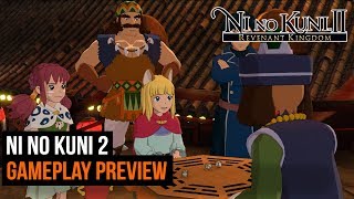 Ni No Kuni II har två stycken huvudkaraktärer; pojkkungen Evan och den lite mer vuxna Roland. Evan var kung i Ding Dong Dell, men blev utkastad från kungadömet efter en kupp och Roland kommer från den riktiga världen och har kastats in detta universum av en oklar anledning. Du har möjlighet att skifta fritt mellan karaktärerna precis när du vill och under spelets gång får du tillgång till fler medhjälpare som du också kommer kunna kontrollera. Alla karaktärer har vitt skilda fightingstilar och erbjuder på så vis en hel del variation under spelets gång. Som sagt så fick vi spela igenom två kapitel precis i början av spelet och varav ena utspelade sig i Taiwan-inspirerade staden Goldpaw där vi fick lösa lite mysterium och det andra kapitlet fokuserade en hel del på de nya spellägena Kingdom Mode och Skirmish Mode. Vi har tidigare fått reda på att storyn i spelet kommer rikta sig till en mer vuxen publik jämfört med föregångaren, vilket framgick en del under vår tid med spelet. Musiken i spelet har tagits fram av Joe Hisaishi, som tidigare levererat musik till diverse Studio Ghibli-filmer samt det första Ni No Kuni, och kompositionerna har framförts av Tokyo Philharmonic Orchestra. Musiken är riktigt lekfull och härlig och under mer seriösa tillfällen, som strider och liknande, ändras ton och tempo och bygger på de episka ögonblicken med en lika episk ljudbild. I Ni No Kuni: Wrath of the White Witch var striderna mer tur-baserade och du fick inte kontrollera några av karaktärerna, utan endast monster som du fångat på resans gång. I Revenant Kingdom har Level-5 gjort om hela fightsystemet och gjort det hela betydligt mer actionspäckat. Du kontrollerar Evan eller någon av de andra karaktärerna och du har tillgång till närstridsvapen och magi för att sänka fienden på ett effektivt sätt. Under striderna har du också möjlighet att aktivera de nya figurerna som döpts till Higgledies som kommer i olika färger och beroende på vilken färg som aktiveras så utförs olika åtgärder. Gröna Higgledies skapar ett område som healar dina hjältar, vita skadar fienden och röda skapar ett område som skyddar dig från massiva attacker. Det känns riktigt bra att fritt kunna springa runt på stridsfältet för att klå fiender på bästa sätt och jämfört med fightsystemet i föregående spel så föredrar jag det lite mer actionspäckade systemet. De nya tillskotten Kingdom Mode och Skirmish Mode är också riktigt roliga och välutförda. I Kingdom Mode får du styra och ställa i ett nytt kungadöme och där du får bygga olika byggnader som i sin tur kan förse dig med hjälp under resans gång. Till exempel kan du bygga en smed som ger dig tillgång till bättre vapen och du forska fram olika uppgraderingar som låter dig slåss mer effektivt. För att forska snabbare så får du rekrytera olika karaktärer från runt om i världen som du i sin tur kan placera i olika byggnader. Karaktärerna är olika och är mer effektiva på specifika ställen. En vapensmed är till exempel mer effektiv hos just smeden, men det finns även karaktärer som är lite mer varierade och passar bra i olika hus. För att se hur effektiva befolkningen är så har varje karaktär en nivåmätare, vilket gör det lätt att se var du bör placera ut dem. Under tidens gång genererar ditt kungadöme pengar som du i sin tur kan använda för att fortsätta bygga ut dina ägor. I Skirmish Mode får du slåss mot horder av fiender med din armé i stället för specifika karaktärer. Du har möjlighet att välja trupper som ska medverka i striden och du har några specialförmågor du kan använda under stridernas gång. Själva striderna sker på stora fält och du springer runt med en miniversion av Evan som har möjlighet att utföra diverse specialattacker för att krossa fienden. Både Kingdom Mode och Skirmish Mode är riktigt trevliga tillskott som kommer göra spelupplevelsen betydligt roligare och i alla fall jag kommer troligtvis spendera lite väl många timmar med att optimera kungadömet för att generera så mycket kosing som möjligt. För att sammanfatta så lämnade jag eventet med en positiv känsla. Efter att ha spelat några av spelets inledande kapitel så vill jag bara lira mer. Den nya slagsmålsmekaniken kändes tight, storyn var intressant och jag kommer definitivt spendera otaliga timmar i det nya läget Kingdom Mode. Och på det en fantastisk design, härlig musik och en touch av Studio Ghibli spelet ännu mer intressant. Ni No Kuni II: Revenant Kingdom kommer släppas 23 mars till Playstation 4 och PC. Här under hittar ni några fler preview-videor från andra medier.