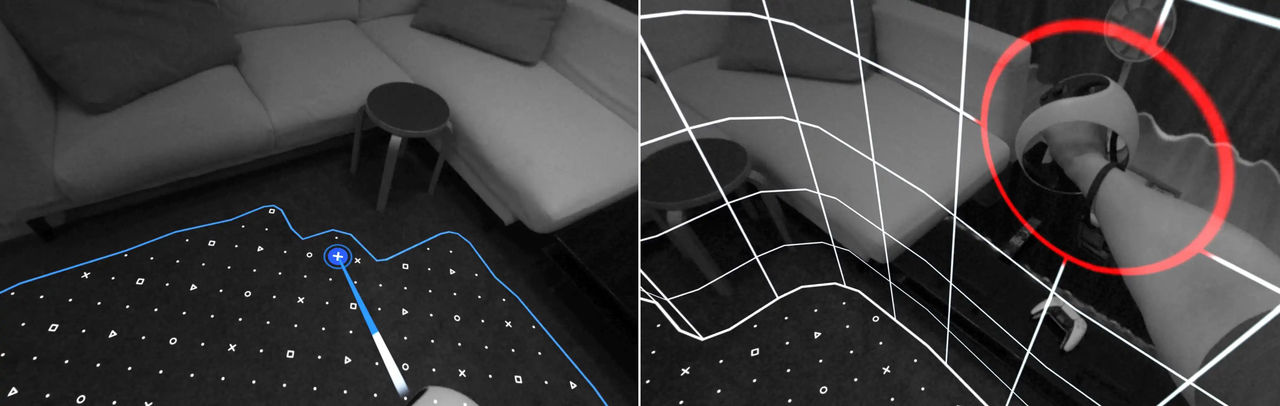 Sony har visat upp lite av de funktioner som kommer inkluderas i PlayStation VR2, deras kommande virtual reality-headset till PlayStation 5. En av funktionerna är att spelare kommer att kunna streama hur det ser ut när de spelar olika VR-spel via en PS5 HD Camera som är kopplad till PlayStation 5. Ni kan kolla in ett exempel på hur det skulle kunna se ut på bilden här ovanför. Det kommer även att finnas en så kallad "see through"-funktion vilken gör att spelare kan se vad som finns i "den riktiga världen" utan att behöva ta av sig headset, se bildexempel nedan. PS VR2 kommer även att få en funktion som gör det möjligt för spelaren att anpassa inom vilket område användaren kan röra sig i det fysiska rummet, något som kanske kan vara intressant för att förhindra att spelaren travar in i möbler eller river ner saker i den fysiska världen. Skulle spelaren vara på väg att röra sig utanför det anpassade spelområdet under spelets gång så kommer det att komma upp en varning om detta i headsetet. Här nedanför hittas bilder som visar hur spelare kan anpassa spelområdet samt hur varningen kan se ut när spelaren närmar sig gränsen för detta område. Sony har än så länge inte meddelat när man planerar att släppa PS VR2 eller vad detta kommer att kosta.