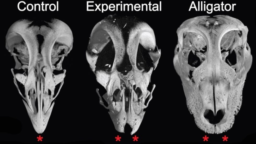Att fåglar är avlägsna släktingar till dinosaurier är sedan länge känt och nu har några forskare på amerikanska Yale University lyckats få ett embryo från en kyckling att utveckla dinosaurieliknande drag.Något som skiljer dagens fåglar från dåtidens dinosaurier är att dinosauriens käkparti består av två separata käkben medan fåglarna istället har en näbb. Forskarna på Yale har lyckats blockera två proteiner i kycklingembryot som gjort att istället för att utveckla en näbb har den utvecklat en dinosaurieliknande käkparti. Bhart-Anjan Bhullar på Yale säger: "This was unexpected and demonstrates the way in which a single, simple developmental mechanism can have wide-ranging and unexpected effects." Genom det här experimentet hoppas forskarna få en klarare bild av hur evolutionen en gång i tiden gjorde så att fåglarna utvecklades. Bild: Bhart-Anjan Bhullar/Yale University