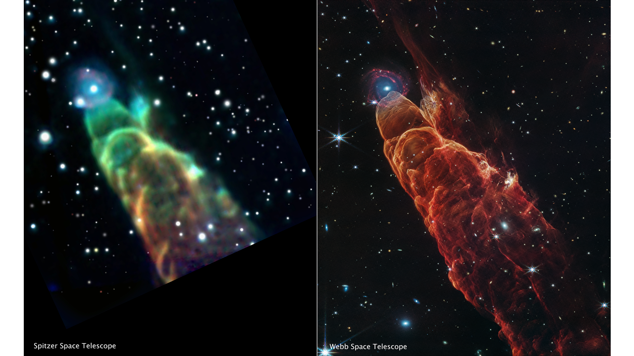 NASA/ESA/CSA:s rymdteleskop har fotat en ny fantastisk bild på ett så kallat Herbig-Haro-objekt i vår egen galax Vintergatan vilken ni kan kolla in här ovanför. Herbig-Haro-objekt (HH-objekt) är en typ av små nebulosor som bildas av när gas från nyfödda stjärnor kolliderar med annan gas och stoft i dess närhet. HH-objektet på bilden ovan har fått beteckningen Herbig-Haro 49/50 och ligger cirka 630 ljusår från jorden i stjärnkonstellationen Kameleonten, en av de mest aktiva platserna för stjärnfödslar i Vintergatan. Herbig-Haro 49/50 fotades första gången av Spitzer-teleskopet 2006. Då var astronomerna osäkra på vad det var som lyste vid slutet av objektet. När nu James Webb-teleskopet fotat Herbig-Haro 49/50 syns det tydligt att det handlar om en spiralgalax någonstans långt ute i universum. De kommande tusentals åren kommer Herbig-Haro 49/50 att växa så pass mycket att spiralgalaxen som syns på bilden ovan kommer att döljas av HH 49/50. Här nedanför hittas en jämförelsebild på Herbig-Haro 49/50 fotad av Spitzer respektive James Webb. Nedan finns även ett videoklipp där man berättar lite mer om James Webbs senaste foto.