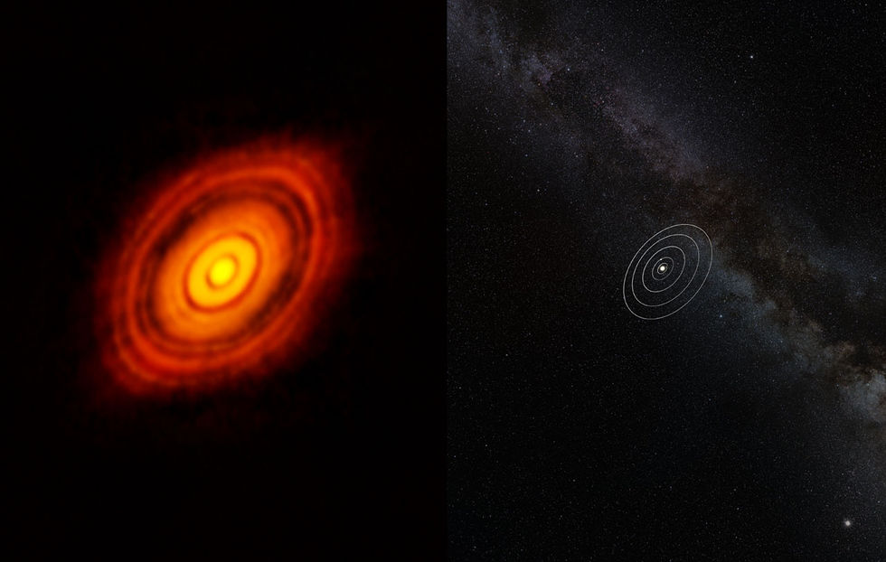 European Southern Observatorys (ESO) teleskop ALMA har tagit vad som ska vara den skarpaste bilden man någonsin fotograferat och bilden visar hur ett solsystem sakta börjar byggas upp runt den "unga" stjärnan HL Tauri.HL Tauri ligger runt 450 ljusår från vårt eget solsystem och Catherine Vlahakis. biträdande vetenskapliga projektledare för ALMA och projektledare för ALMA:s Long Baseline Campaign, säger i ett uttalande på ESO:s hemsida: "När vi såg bilden för första gången häpnade vi över de spektakulära detaljerna. Vi var mållösa. HL Tauri är inte mer än en miljon år gammal men i skivan verkar det redan finnas en mängd planeter som håller på att bildas. Bara den här bilden kräver i sig en omdaning i teorierna om hur planeter bildas."På bilden nedan kan ni se hur stor HL Tauri är i relation till vårt eget solsystem.