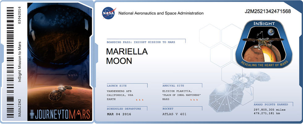 NASA har satt upp en webbtjänst där rymdsugna kan ansöka om ett "boardingkort" till deras rymdfarkost InSight och sedan tar denna med sig alla namnen när den beger sig till den röda planeten.InSight kommer att påbörja sin resa mot Mars nästa år och dess huvuduppgift när den väl kommer fram till planeten kommer att bli borra hål i planetens yta för att sedan analysera innandömet av den, något som aldrig skett tidigare.Preliminärt datum för uppskjutningen av InSight är fjärde mars 2016 och man planerar att landa på Mars den 20:e september 2016.