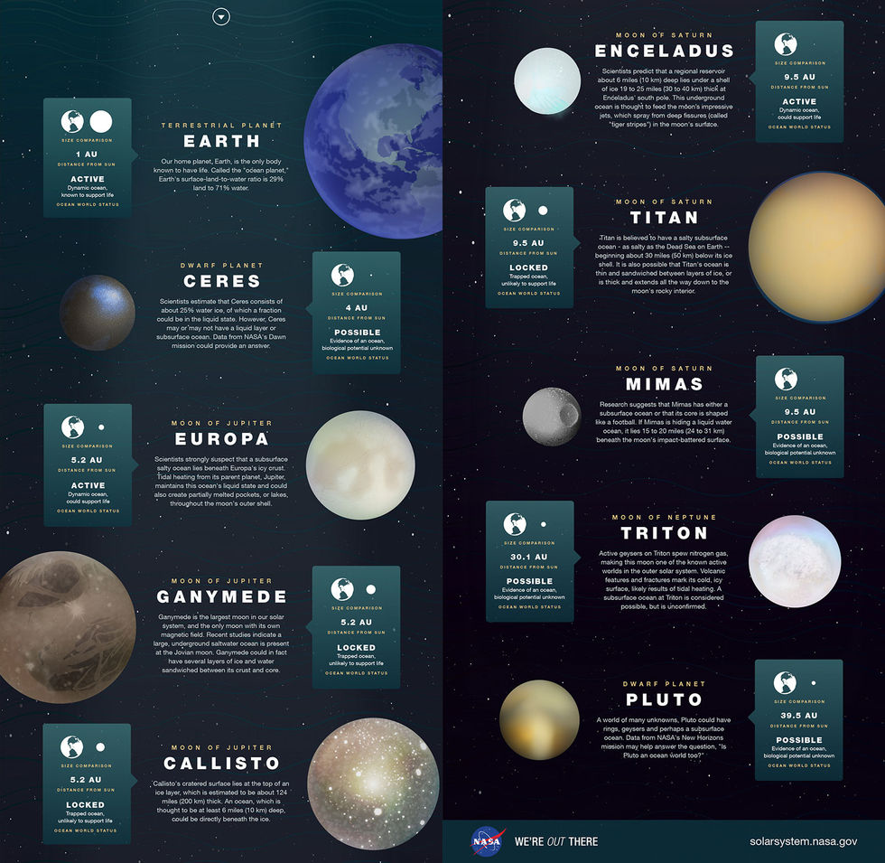 Igår hade NASA en paneldebatt om att hitta liv på andra världar och då sa bland annat NASA:s forskningchef Ellen Stofan att vi antagligen kommer att hitta liv på andra världar inom de kommande tio åren. Stofans exakta citat löd: "I think we're going to have strong indications of life beyond Earth within a decade, and I think we're going to have definitive evidence within 20 to 30 years. We know where to look. We know how to look, In most cases we have the technology, and we're on a path to implementing it. And so I think we're definitely on the road."Jorden är inte den enda himlakroppen med oceaner i vårt solsystem och i grafiken nedan visas de mest troliga kandidaterna där vi kan tänkas hitta utomjordiskt liv i framtiden. En större version av samma bild hittas borta hos NASA här.