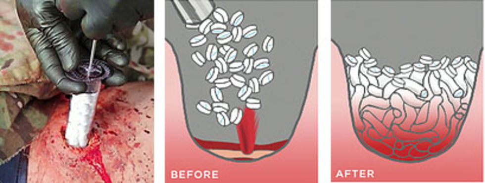 Det amerikanska läkemedelsverket FDA har godkänt en slags spruta som kan användas för att stoppa kraftiga blödningar vid till exempel skottskador och liknande skador.Sprutan är utvecklad av företaget Revmed X och kallas för XSTAT 30. Den är avsedd att användas precis när en skada har uppstått och då sprutar den in expanderbara svampar i såret som förhoppningsvis kan stoppa eller åtminstone mildra blödningarna. Sprutan är givetvis inte avsedd som ersättning för traditionell behandling av sårskador utan ska användas akut innan den skadade kommer under läkarvård.XSTAT 30 har tidigare använts av den amerikanska militären men är alltså nu även godkänd att användas av allmänheten i USA. Nedan hittas en illustration på hur XSTAT 30 är tänkt att fungera. Foto: Revmed X