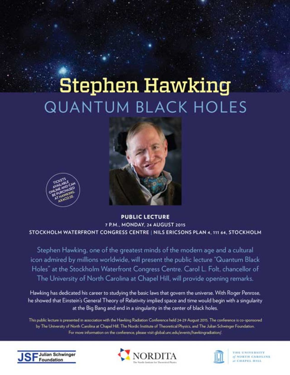 Den världsberömde fysikern Stephen Hawking kommer nästa månad att besöka Stockholm där han kommer att hålla ett föredrag samt delta i en konferens om svarta hål.Konferensen går av stapeln mellan den 24-29:e augusti och där kommer man bland annat snacka om den så kallade Hawkingstrålningen samt om gravitationell singularitet i svarta hål existerar.Föredraget för allmänheten kommer att hållas på Stockholm Waterfront Congress Centre klockan 19:00 den 24:e augusti. Biljetterna kommer att kosta 60 dollar styck och går att köpa här.
