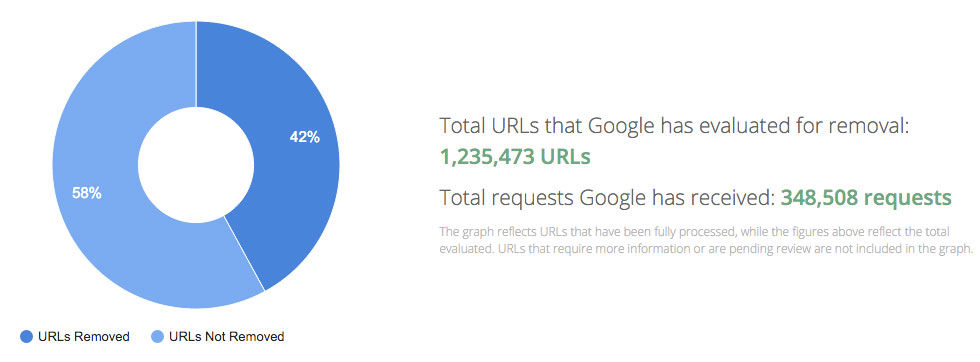 Google har släppt lite ny statistik över hur många i Europa som vill utnyttja den så kallade "rätten att bli glömd" av Google vilken innebär att Google, efter krav från EU, måste radera länkar från sitt sökindex som leder till information om privatpersoner i EU.Sedan Google böjde sig för kraven från EU i maj 2014 har man fått in närmare 350.000 krav (se bild nedan) från personer som vill glömmas bort på den europeiska delen av Googles sökmotor. Totalt handlar det om lite över 1,2 miljoner länkar som privatpersoner vill ha bort från Google och utav dessa säger Google att man har tagit bort 42% medan man i resterande fall inte funnit någon grund till att ta bort länkarna.För svensk del så är det närmare 10.000 privatpersoner som sammanlagt vill ha bort runt 37.000 länkar från Googles sökindex och utav dessa har Google plockat bort 40,9%.