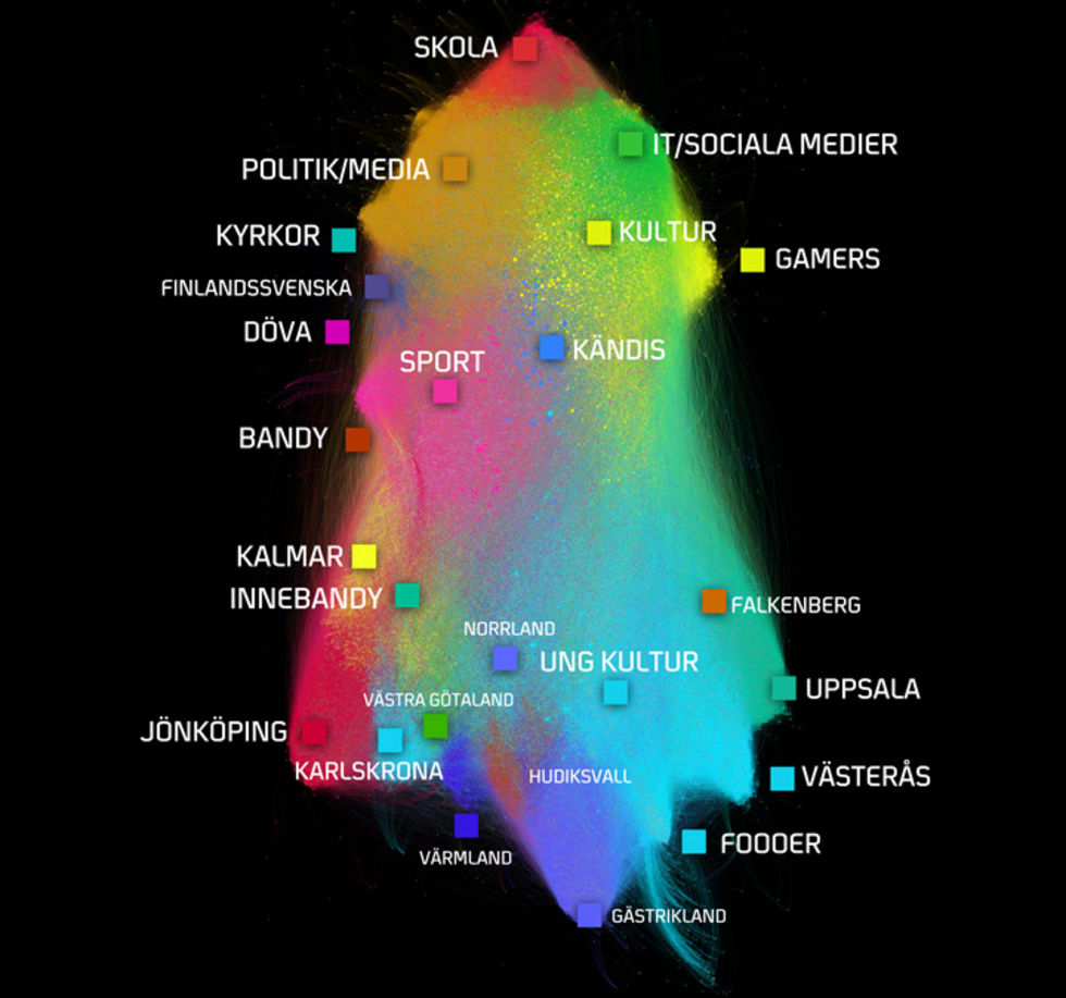 Företaget Intellecta har släppt sin årliga "TwitterCensus"-undersökning där de presenterar hur Twitter-användandet ser ut i Sverige och de andra nordiska länderna.Svenska konton på Twitter uppges nu vara lite över 640.000 stycken medan de konton som anses vara "aktiva" (skrivit fler än 2 tweets, och under den senaste månaden) bedöms vara lite fler än 240.000 stycken. Det ska även finnas närmare 85.000 svenska twitter-konton som enligt TwitterCensus 2014 är "mycket aktiva" (mer än 1 tweet/dag under senaste månaden). Den färgglada "bisvärmen" på skärmdumpen ovan representerar en stor del av svenska Twitter och vad de olika färgerna representerar kan ni kolla in legenden nedan. Själv befinner jag mig i det gröna klustret uppe till höger vilket jag antar passar rätt bra då det representerar "IT/Sociala medier".