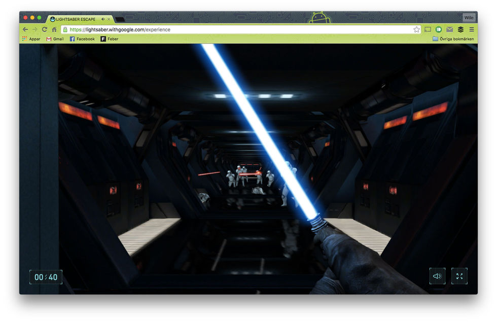 Idag har Star Wars: The Force Awakens premiär i Sverige och skulle du vilja öva upp lite på dina lasersvärdskunskaper inför det så har Google tagit fram ett så kallat Chrome Experiment där man kan testa på att svinga ett lasersvärd.För att dra igång lasersvärdet får man först hoppa vidare på länken nedan där man sedan får en unik webbadress (URL) som man ska besöka med sin telefon för att aktivera lasersvärdet. Därefter får man en kort introduktion där man lär sig parera laserskott med svärdet (telefonen) för att därefter börja strida på riktigt mot ett knippe Stormtroopers. Spelet ska följa webbstandarder och borde fungera i de flesta webbläsarna på marknaden.